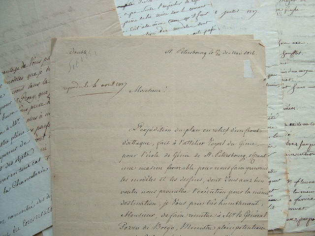 François Emmanuel Molard (Les Cernoisses, 1774/1829)Dossier relatif à la fourniture de maquettes et dessins, par l'administration du Conservatoire des Arts et Métiers, à l'Ecole de Génie de Saint-Pétersbourg. 5 lettres du comte Sievers, général major et commandeur des ingénieurs de l'armée russe, à Pierre Molard. 2 brouillons de lettres de François Emmanuel Molard, sous-directeur du Conservatoire des Arts et Métiers, à Sievers. 3 manuscrits de Pierre Molard : "Liste de quelques machines d'une utilité assez générale que je crois pouvoir recommander à l'intérêt de monsieur le comte Sievers [...]" (28 machines répertoriées, 23 mai 1814 ; «[...] 27° Le moyen de transmettre le mouvement de rotation à une distance plus ou moins grande et dans toutes les directions, sans engrenage, ni corde, ni chaîne, ni courroie. Ces deux articles sont de ma composition et sanctionnés par l'expérience [...]"), suivie d'une «liste de diverses machines communiquée à M. le comte Sievers par l'administration du Conservatoire des Arts et Métiers» ; liste des 11 machines sélectionnées avec le prix de chacune d'elle (pompe à chopelet perfectionnée, scie circulaire avec son moteur, machine propre à percer les murs, bélier hydraulique pour épuisement, etc.) ; "Gacheur de mortier mécanique" (description de la machine par Pierre Molard : 2 pp. in-4). La correspondance est relative à l'exécution et la livraison des 8 dessins et 11 modèles «d'après ceux qui se trouvent dans la collection de l'Ecole des Ponts et Chaussées», destinés à l'instruction des élèves de l'Ecole du Génie de Saint-Pétersbourg.