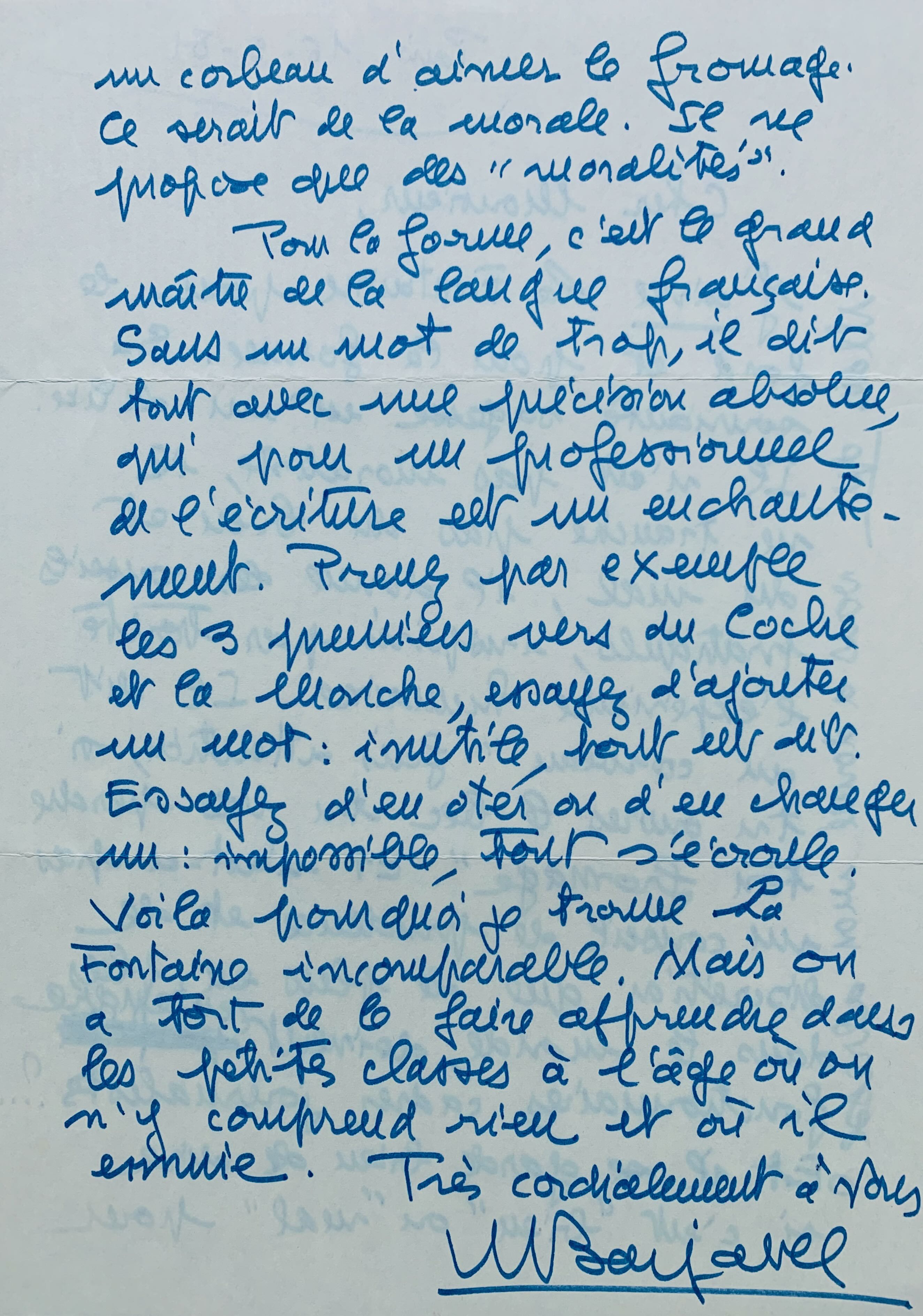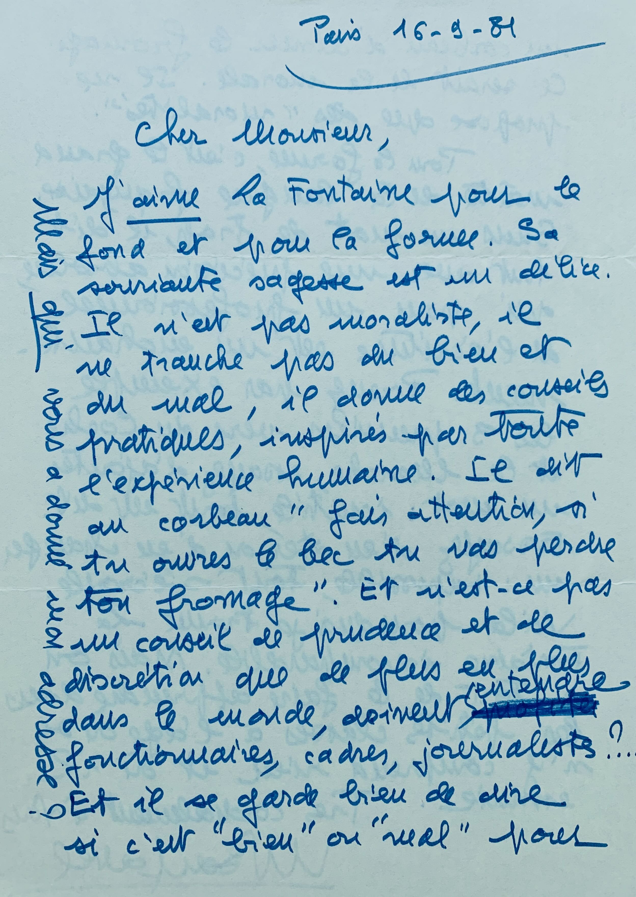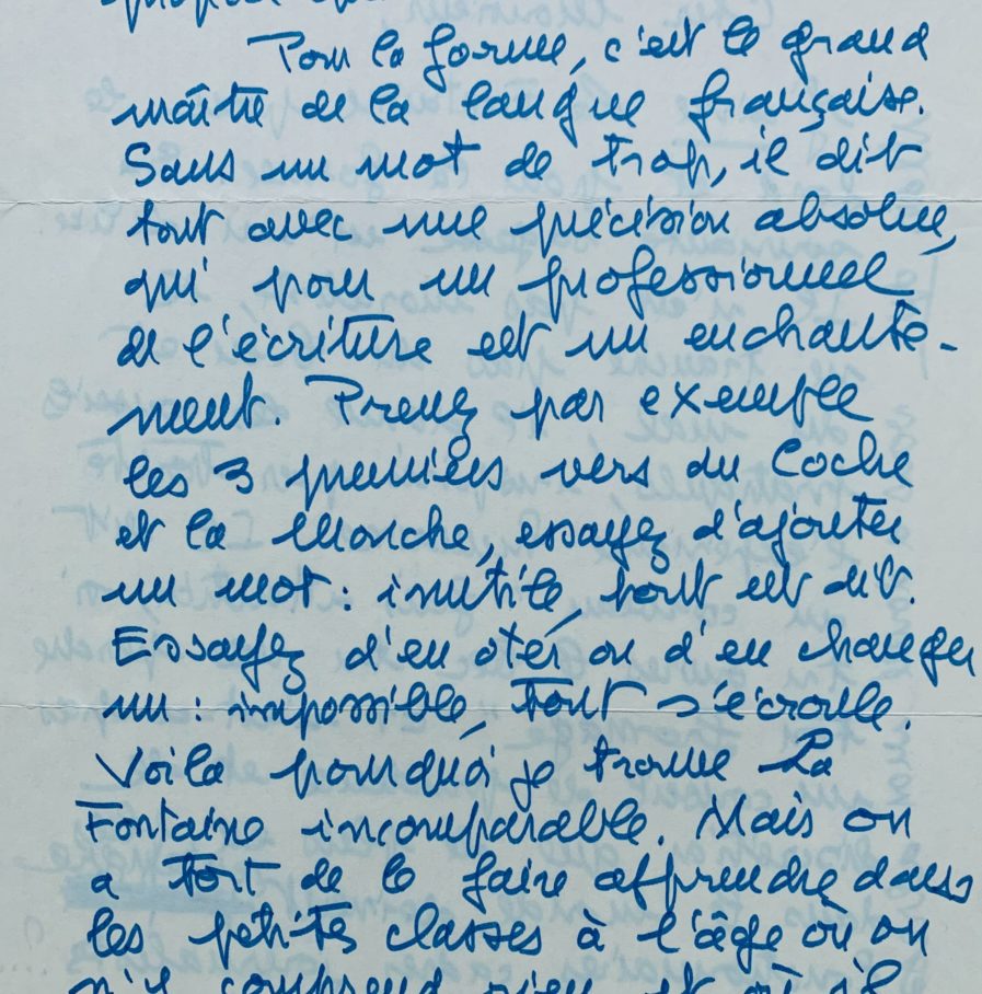 "J'aime La Fontaine pour le fond et pour la forme. Sa souriante sagesse est un délice. Il n'est pas moraliste, il ne tranche pas du bien et du mal, il donne des conseils pratiques, inspirés par toute l'expérience humaine. Il dit au corbeau "fais attention, si tu ouvres le bec tu vas perdre ton fromage". Et n'est-ce pas un conseil de prudence et de discrétion que de plus en plus dans le monde, doivent entendre fonctionnaires, cadres, journalistes?... Et il se garde bien de dire si c'est "bien" ou "mal" pour un corbeau d'aimer le fromage. Ce serait de la morale. Il ne propose que des "moralités". Pour la forme, c'est le grand maître de la langue française. Sans un mot de trop, il dit tout avec une précision absolue, qui pour un professionnel de l'écriture est un enchantement. Prenez par exemple les 3 premiers vers du Coche et de la mouche, essayer d'ajouter un mot : inutile, tout est dit. Essayer d'en ôter ou d'en changer un : impossible, tout s'écroule. Voilà pourquoi je trouve La Fontaine incomparable. Mais on a tort de le faire apprendre dans les petites classes à l'âge où on n'y comprend rien et où on s'ennuie".