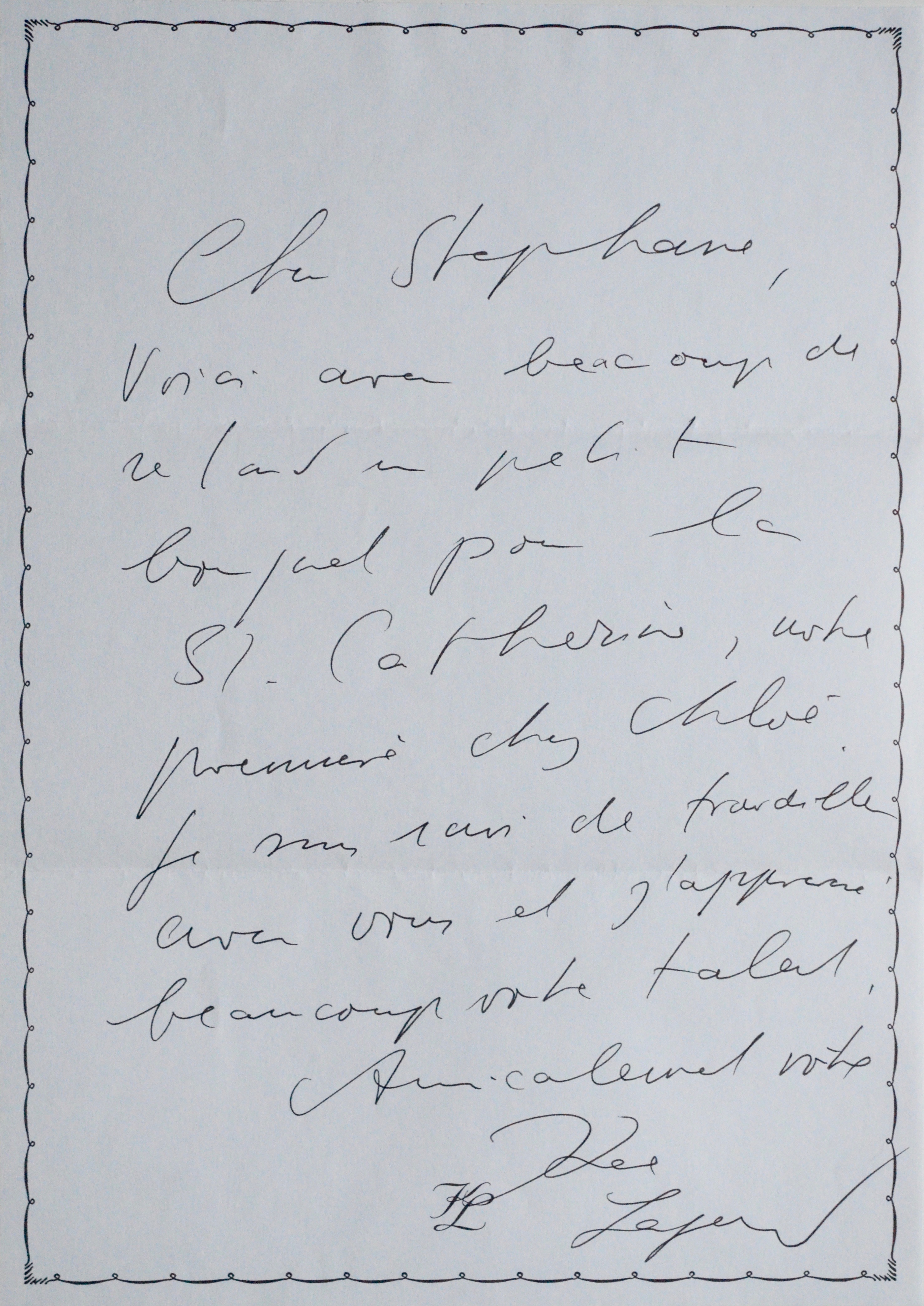 Karl Lagerfeld fait parvenir à son collaborateur, Stéphane Murray, un bouquet pour la Sainte-Catherine, "votre première chez Chloé". Il ajoute "je suis ravi de travailler avec vous et j'apprécie beaucoup votre talent [...]".
