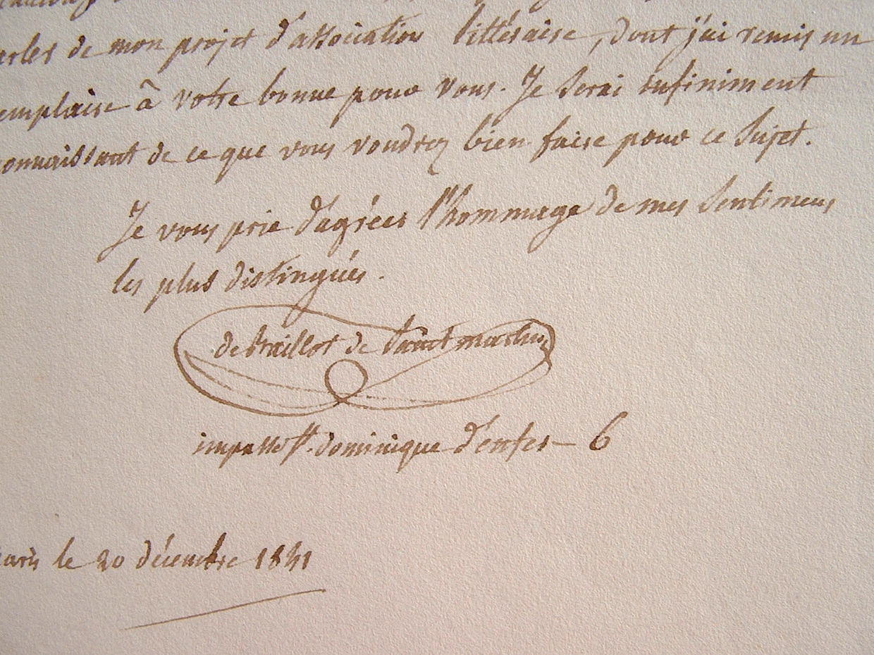 L'agronome spécialiste du tabac (il publia plusieurs ouvrages sur le sujet dont L'art du fabriquant de tabac, en 1807) Baillot de Saint-Martin a désormais une toute autre activité en vue : former une association littéraire. «Je sais combien vous êtes obligeant et que vous avez beaucoup de connaissances : c'est pourquoi je vous prie de leur parler de mon projet d'association littéraire, dont j'ai remis un exemplaire à votre bonne pour vous [...]».