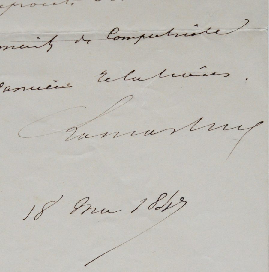 Alphonse de Lamartine, alors député, ne peut rendre ouvertement service à son correspondant mais il accepte de dire du bien de ce dernier, à toute personne qui viendrait lui demander son avis, mais seulement si on le lui demande. Il ajoute "Je suis absolument étranger à la demande que vous fait mon garde de Saint-Point d'une carabine dont le port lui est je crois interdit par la loi [...]".
