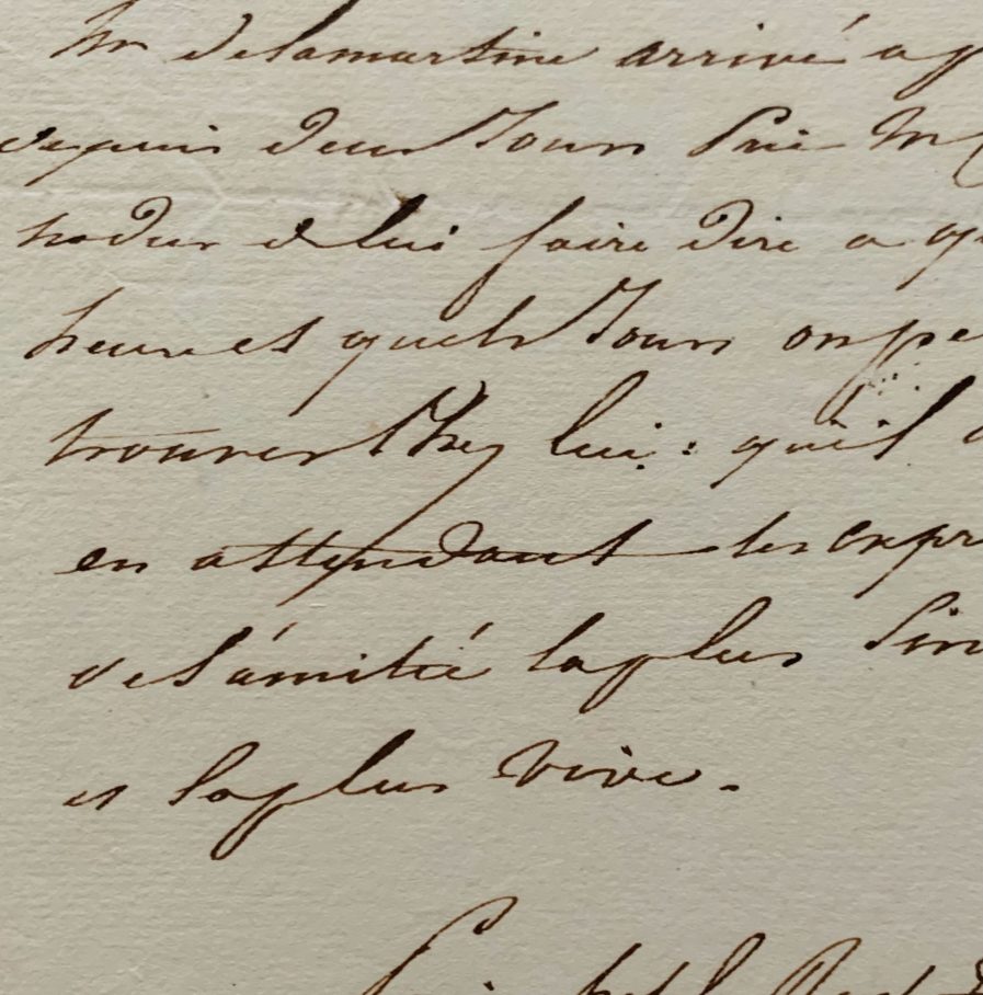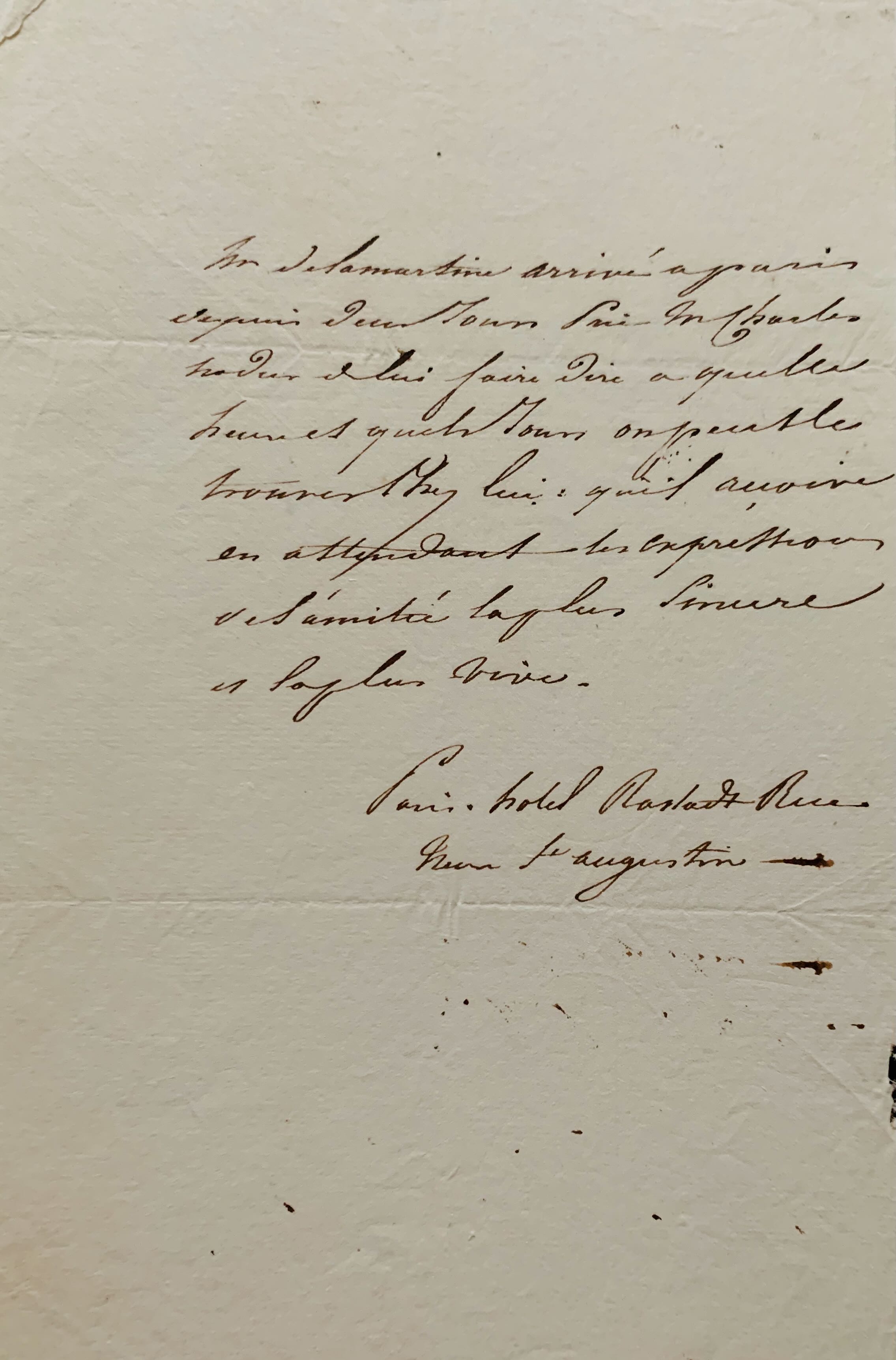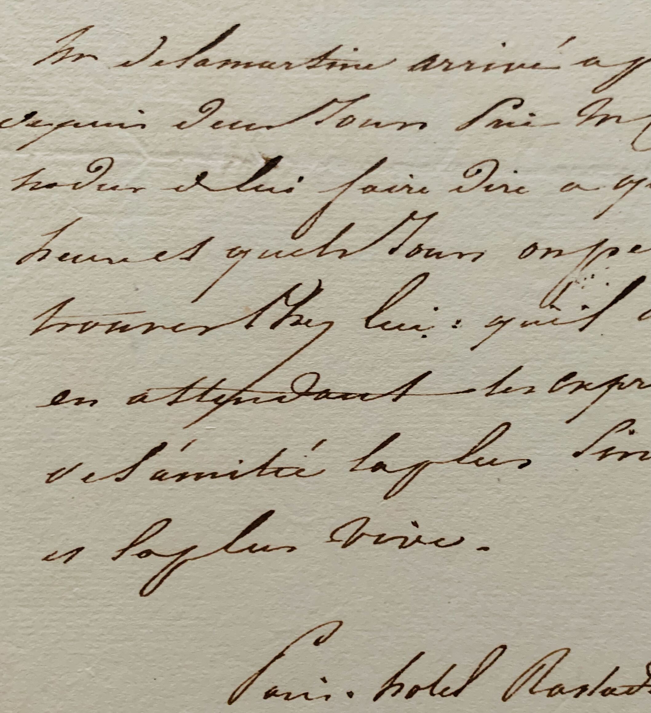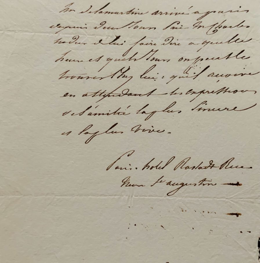 "Mr de Lamartine arrivé à Paris depuis deux jours prie M. Charles Nodier de lui faire dire à quelle heure et quels jours on peut le trouver chez lui; qu'il reçoive en attendant les expressions de l'amitié la plus sincère et la plus vive.