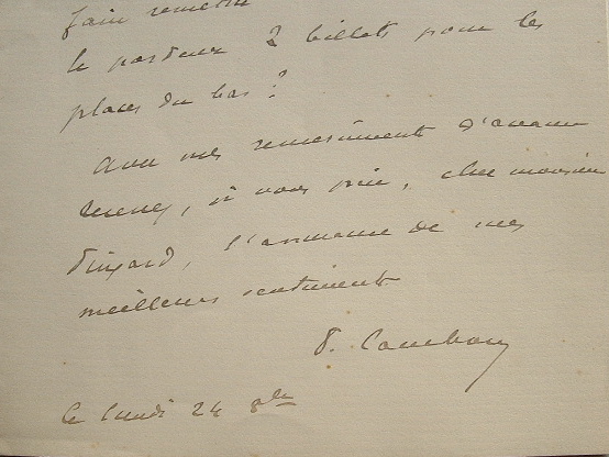 «J'apprends en arrivant à Paris que la séance annuelle de l'Institut a lieu aujourd'hui ou demain. Seriez-vous assez bon pour me renseigner à ce sujet et pour me faire remettre en même temps par le porteur 2 billets pour les places du bas ? [...]».
