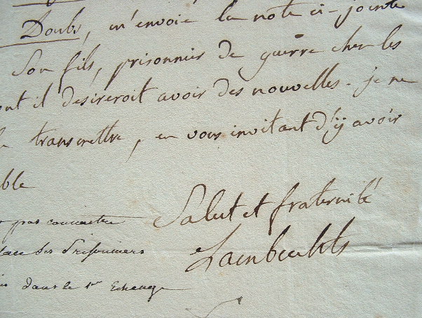 Lambrechts transmet la demande d'un citoyen de Verdun-sur-le-Doubs, sans nouvelles de son fils «prisonnier de guerre chez les Autrichiens dont il désirerait avoir des nouvelles». Une note indique : «L'ennemi ne fait pas connaître les lieux où il place les prisonniers et sera compris dans le 1er échange».