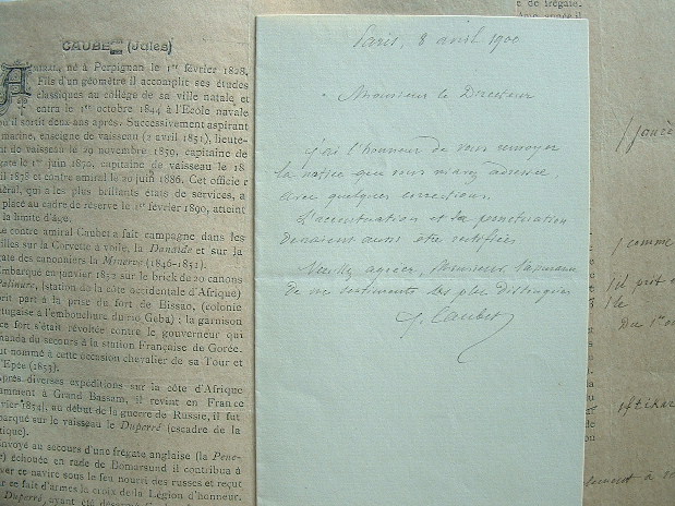 Epreuves d'une notice biographique du contre-amiral Jules Caubet, avec corrections autographes et lettre d'envoi. Campagne des Antilles, expéditions sur les côtes d'Afrique, guerre de Crimée, mission navale au Brésil, etc.