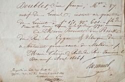 Rosamel, alors commandant la division navale des Mers du Sud, donne ordre au capitaine de vaisseau commandant la frégate du roi l'Aréthuse, de recevoir un matelot malade, débarqué du brick Le Cygne à Rio de Janeiro. Rédigé à Bord de la frégate Marie-Thérèse, en rade de Rio de Janeiro, le document est également signé par le commandant du brick. Au dos, figurent les comptes versés au matelot pour ses services à bord du brick, comptes signés par le commis aux revues du Cygne.