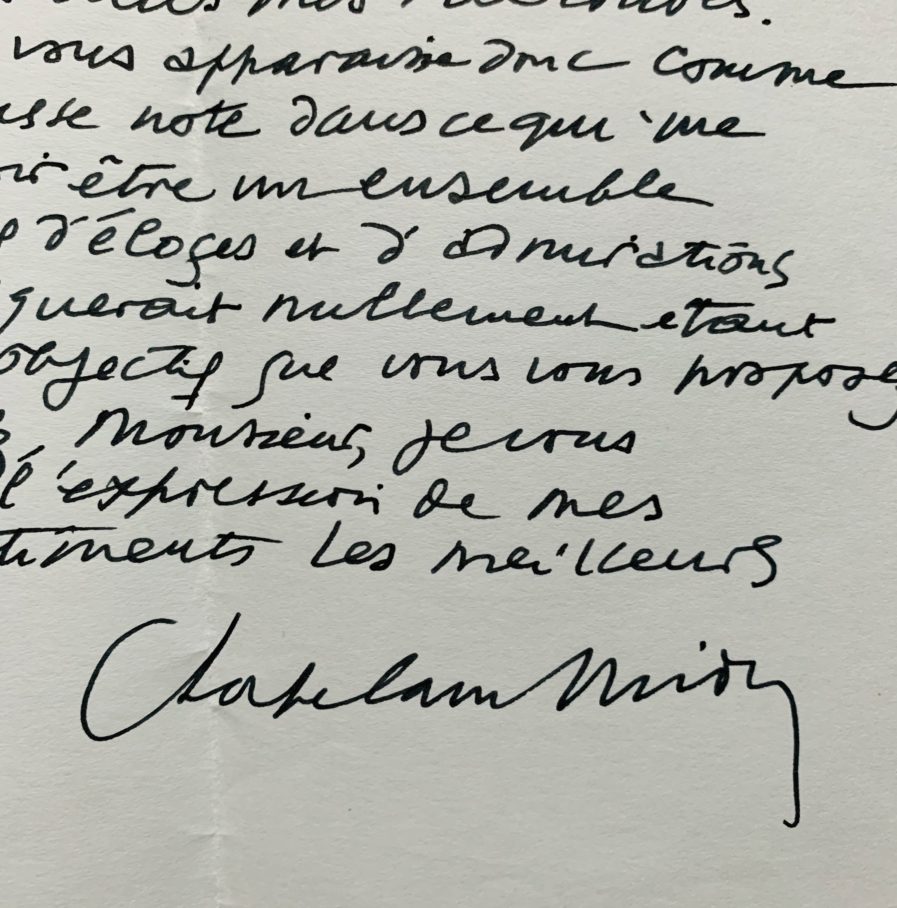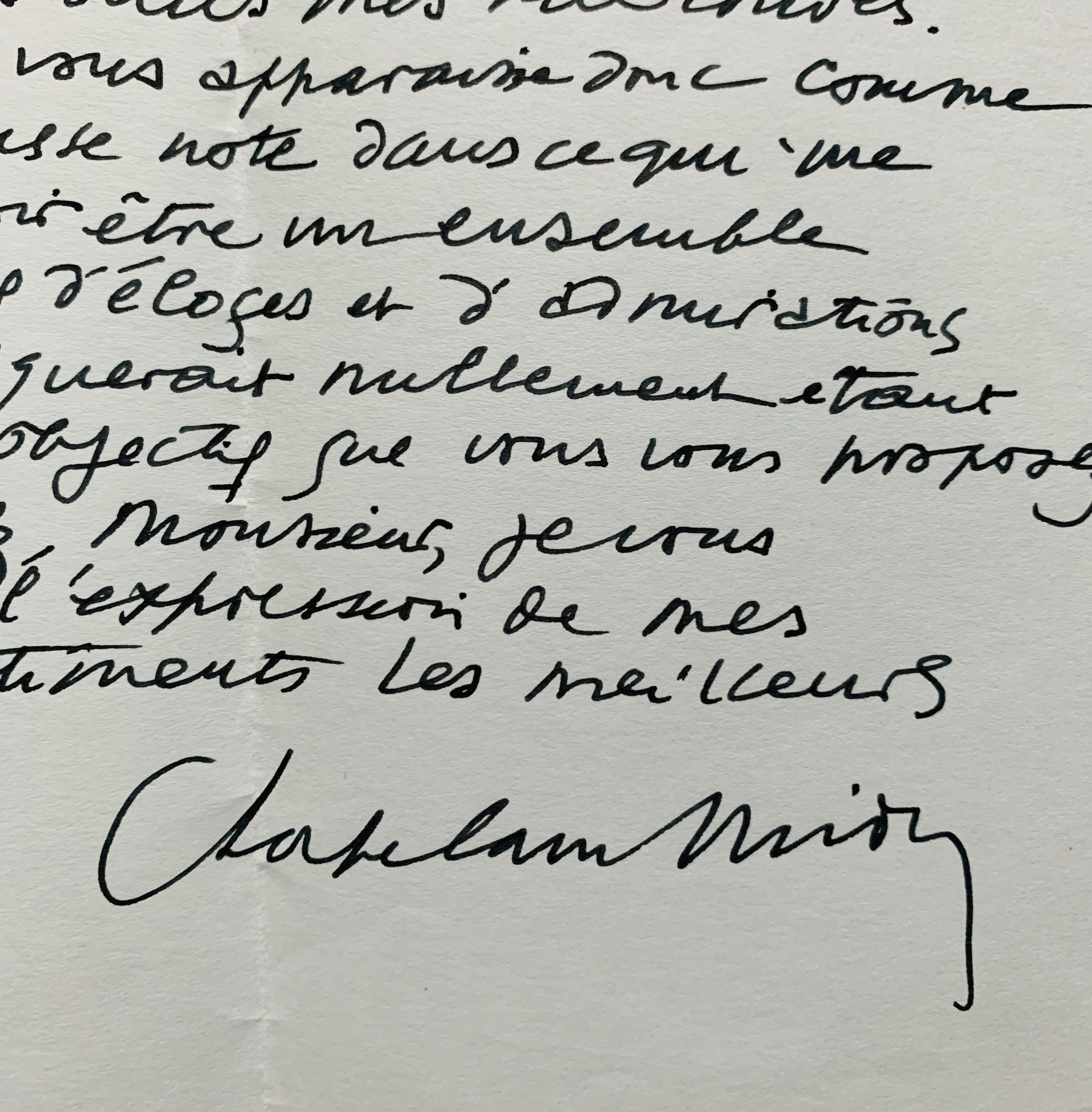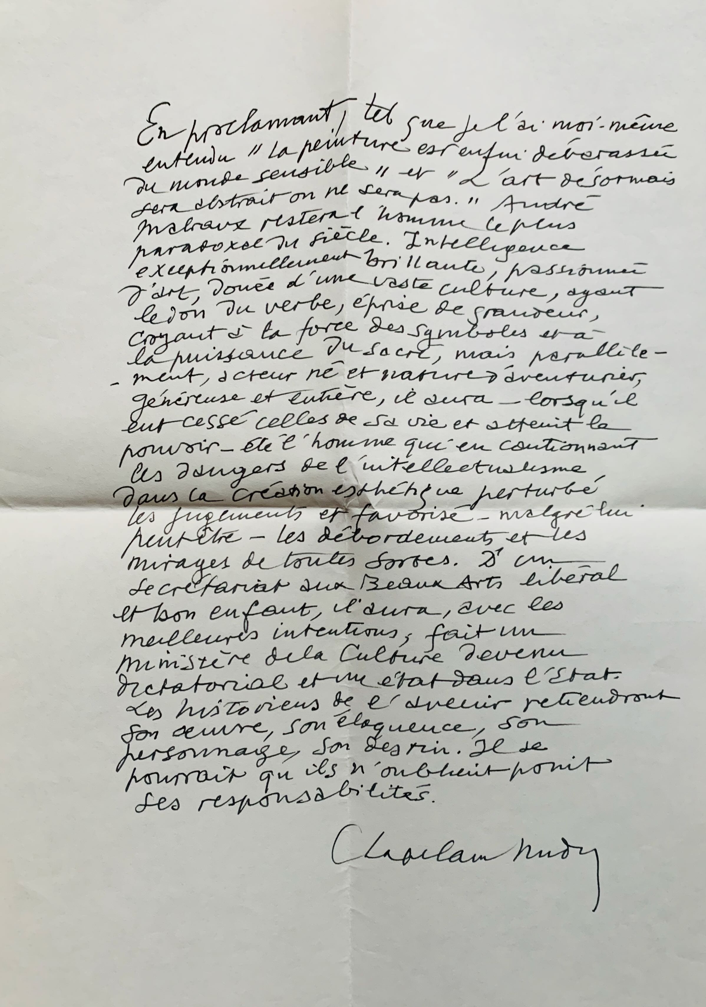 Roger Chapelain-Midy (Paris, 1904/1992)En réponse à une sollicitation pour un hommage à André Malraux, Roger Chapelain-Midi refuse de se joindre à l'admiration générale. Il envoi son texte et s'en explique dans une lettre.