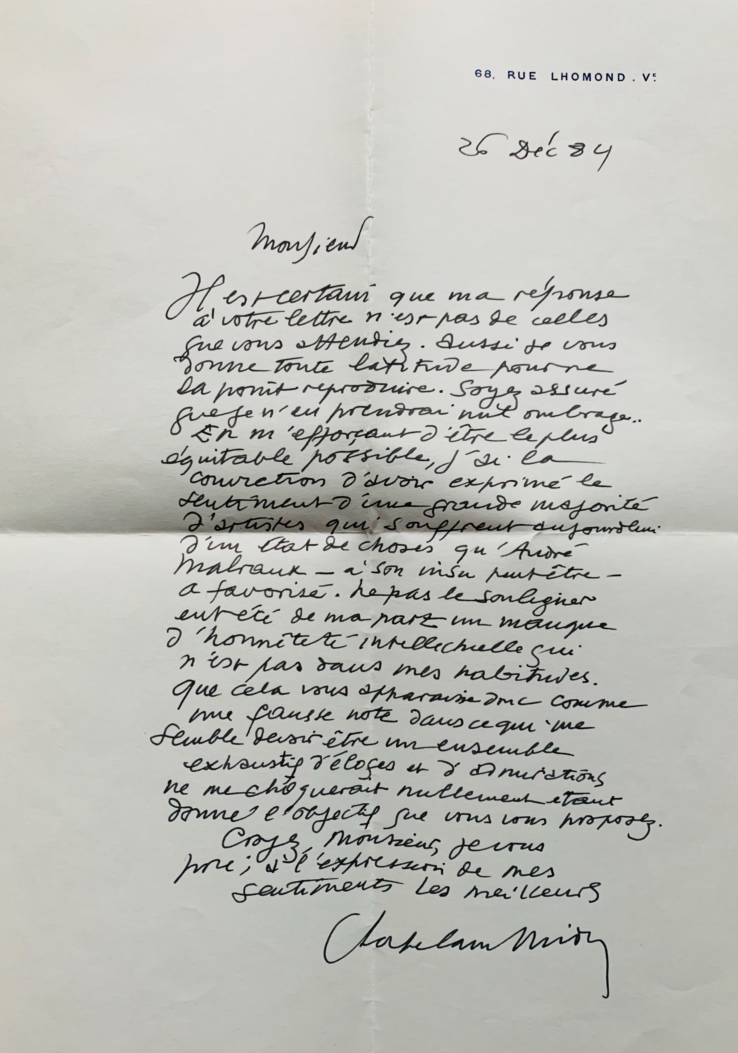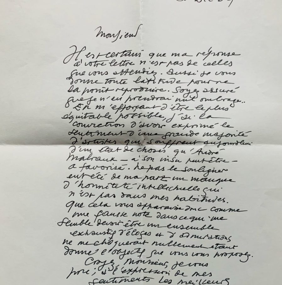 "Il est certain que ma réponse à votre lettre n'est pas de celles que vous attendiez [...]. En m'efforçant d'être le plus équitable possible, j'ai la conviction d'avoir exprimé le sentiment d'une grande majorité d'artistes qui souffrent aujourd'hui d'un état de choses qu'André Malraux - à son insu peut-être - a favorisé. Ne pas le souligner eut été de ma part un manque d'honnêteté intellectuelle qui n'est pas dans mes habitudes [...]".