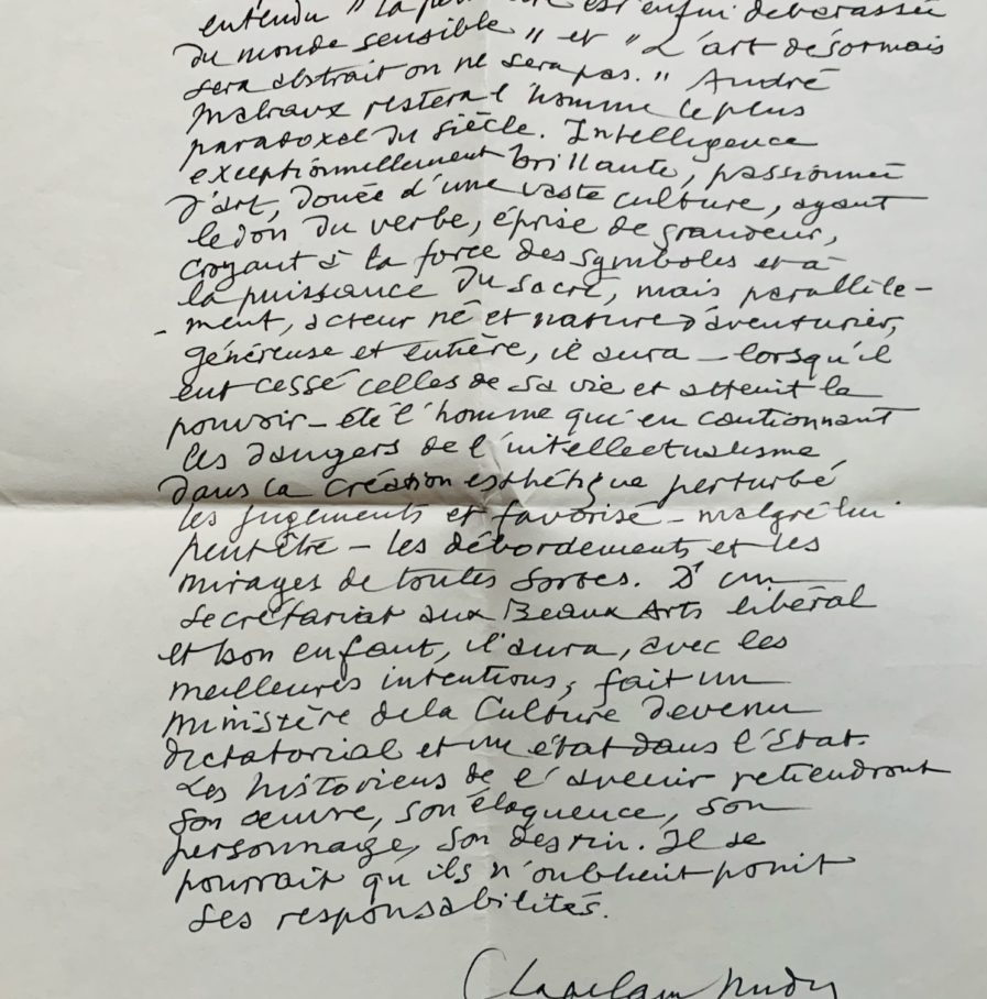 "En proclamant, tel que je l'ai moi-même entendu "la peinture est enfin débarrassée du monde sensible" et "l'art désormais sera abstrait ou ne sera pas", André Malraux restera l'homme le plus paradoxal du siècle. Intelligence exceptionnellement brillante, passionnée d'art, douée d'une vaste culture, ayant le don du verbe, éprise de grandeur, croyant à la force des symboles et à la puissance du sacré, mais parallèlement acteur né et nature d'aventurier, généreuse et entière, il aura - lorsqu'il eut cessé celles de sa vie et atteint le pouvoir - été l'homme qui en cautionnant les dangers de l'intellectualisme dans la création esthétique, perturbé les jugements et favorisé - malgré lui peut-être - les débordements et les mirages de toutes sortes. D'un secrétariat aux beaux-arts libéral et bon enfant, il aura, avec les meilleurs intentions, fait un ministère de la Culture dictatorial et un état dans l'état [...]".