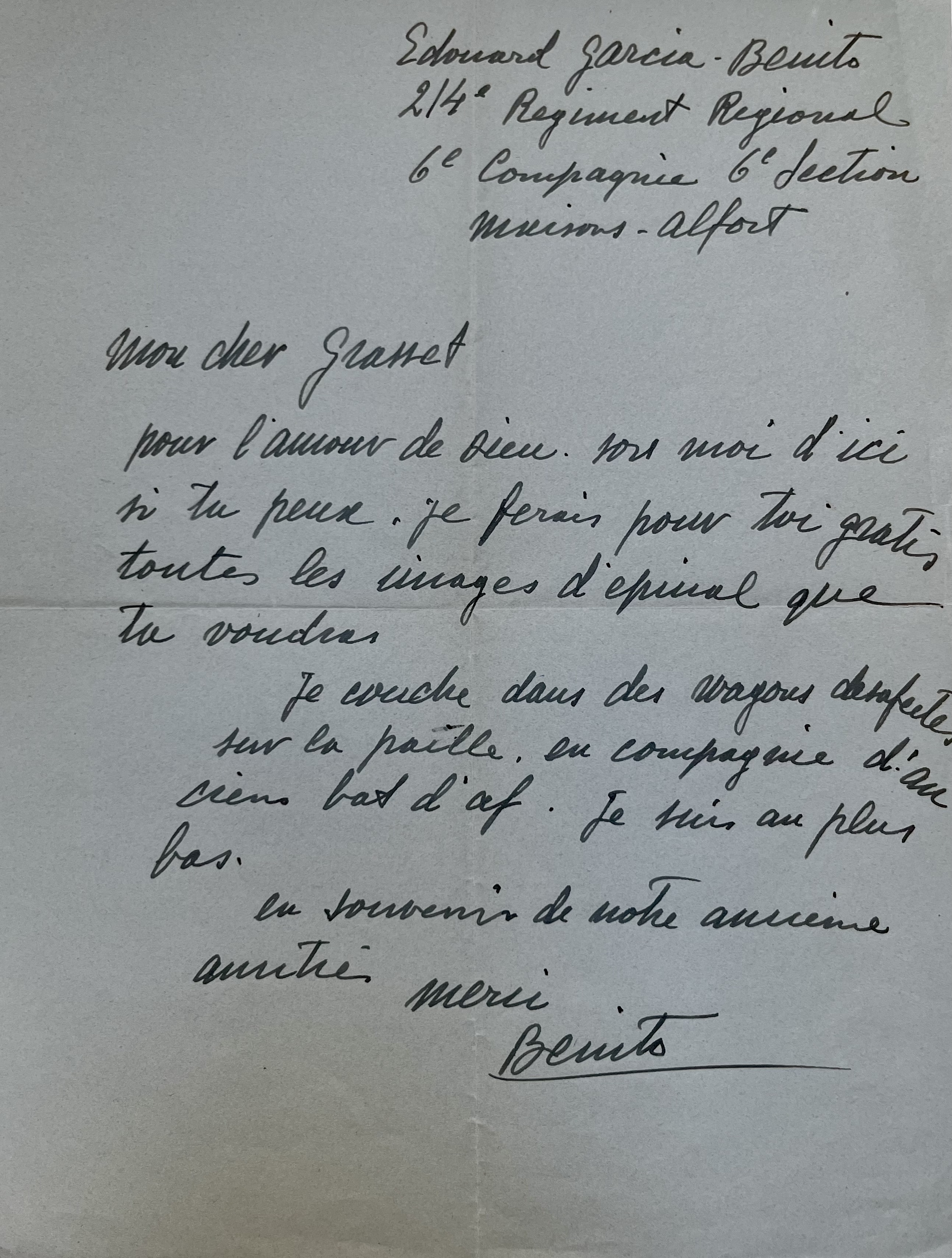Pour l'amour de Dieu, sors moi d'ici si tu peux. Je ferais pour toi gratis toutes les images d'Épinal que tu voudras. Je couche dans des wagons désaffectés sur la paille en compagnie d'ancien bat d'af [bataillons d'infanterie légère d'Afrique]. Je suis au plus bas. En souvenir de notre ancienne amitié. Merci. Benito".