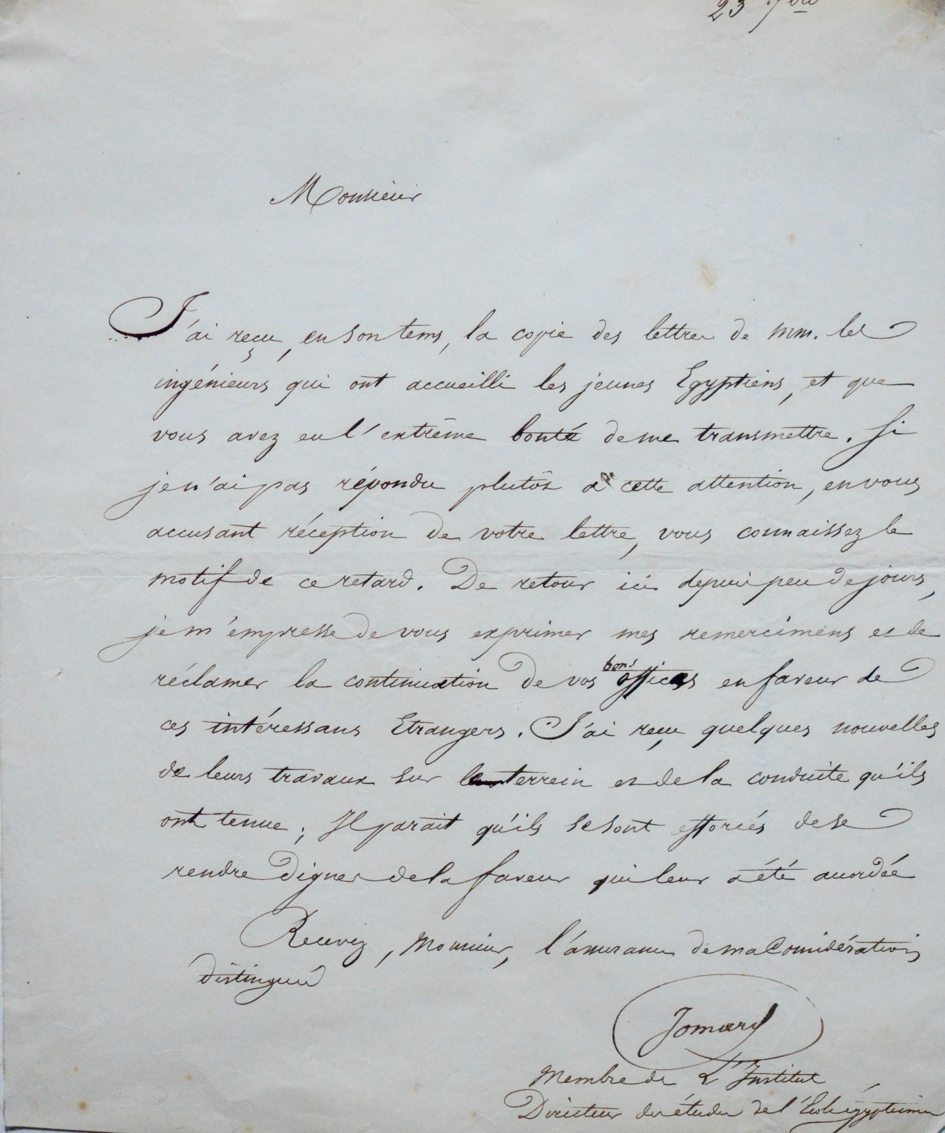 Edme François Jomard a reçu la copie des lettres de MM. les ingénieurs qui ont accueilli les jeunes Egyptiens, et a tardé à y répondre : "[...] De retour ici depuis peu de jours, je m'empresse de vous exprimer mes remerciements et de réclamer la continuation de vos bons offices en faveur de ces ingénieurs étrangers. J'ai reçu quelques nouvelles de leurs travaux sur le terrain et de la conduite qu'ils ont tenue ; il parait qu'ils se sont efforcés de se rendre dignes de la faveur qui leur a été accordée [...]".