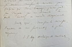 Victor-Auguste Deschamps (Melle, 1810/1883)Dans une première lettre à l'homme de lettres Camille Marsuzi de Aguirre, l'Archevêque de Malines, Victor-Auguste Deschamps, soutient son action et ses vues : « Je partage toutes vos pensées : non, il ne suffit pas de protester mais il faut demander en motivant la demande, en l'appuyant sur notre droit et sur le devoir correspondant de tous les États ayant des sujets catholiques. Oui, il faut agir en ce sens avec ensemble ; oui, il faut tenir la main à cette oeuvre de civilisation et de paix. » Il faut selon lui le soutien de la presse : du Journal de Bruxelles, où Marsuzi de Aguirre a beaucoup écrit, mais aussi du Bien public. Et puis il faut cesser de publier anonymement des brochures ; il faut les signer : « Un saint, parfaitement humble par conséquent, saint Alphonse de Liguori n'en disait pas moins : "Je signe mes livres afin qu'on les lisent." ». Dans la seconde lettre, il recommande au Ministre une mère de famille frappée d'infortune : « C'est une pensée de femme en pleurs et dont le mari ne fait rien. Je n'ai garde de parler de semblables choses à Sa Majesté, mais après avoir lu la lettre de Madame Courtois, je crois bien faire de la confier au Ministre lui-même. C'est plus droit, plus simple & plus sûr. Je sais que cette famille mérite l'intérêt que lui porte Monsieur le Bourgmestre de Tournay, et a lieu de faire valoir auprès de vous les raisons d'unir la miséricorde à la justice, j'ai préféré, Monsieur le Ministre, faire passer sous vos yeux le plaidoyer d'un coeur de mère. » On joint deux portraits gravés du Cardinal Deschamps, dont l'un d'après une photographie de Ghémar Frères.
