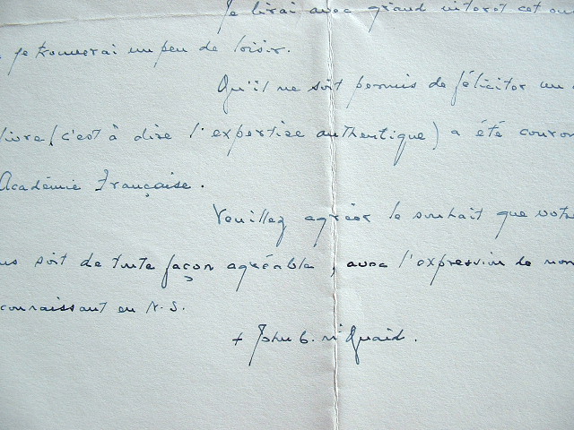 L'archevêque primat d'Irlande, John Charles Mac Quaid, remercie Michel de Saint-Pierre pour l'envoi de son livre et sa dédicace. «Cette courtousie m'a vivement touché. Je lirai avec grand intérêt cet ouvrage, dès que je trouverai un peu de loisir. Qu'il me soit permis de féliciter un auteur dont le livre (c'est à dire l'expertise authentique) a été couronné par l'Académie française [...]». [Michel de Saint-Pierre avait reçu le Grand prix du roman de l'Académie].