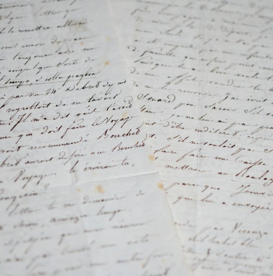Encre brune sur deux feuillets doubles. Adresses au verso des seconds feuillets dont une avec marques postales.