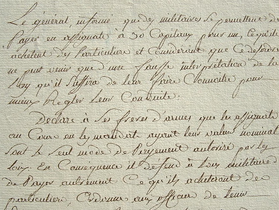 Ordre de la division de l'Armée des côtes de l'Océan, signé pour copie conforme par le chef de l'arrondissement d'Ancenis et chef de bataillon, Eymenier. Cet ordre contraint tous les militaires à payer en assignats leurs achats aux particuliers. «Le général, informé que des militaires se permettent de payer en assignats à 30 capitaux pour un, ce qu'ils achètent des particuliers, et considérant que ce désordre ne peut venir que d'une fausse interprétation de la loy qu'il suffira de leur faire connaître pour mieux régler leur conduite, déclare à ses frères d'armes que les assignats au cours ou les mandats ayant leur valeur nominale sont le seul mode de payement autorisé par les loix. En conséquence il défend à tous militaires de payer autrement ce qu'ils achètent des particuliers [...]».