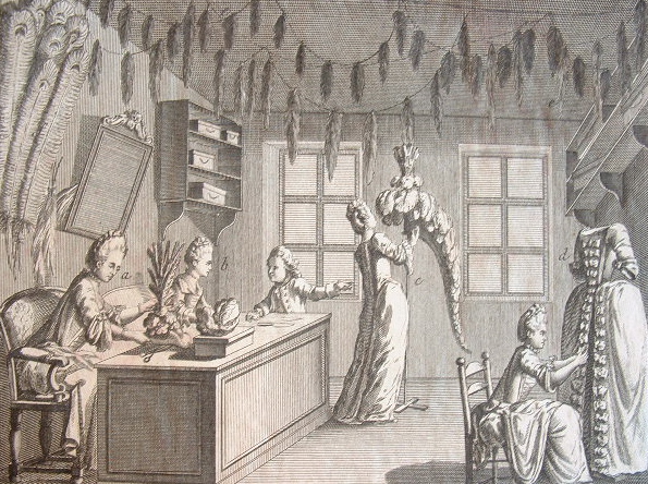 Série de 5 planches gravées extraites de l'Encyclopédie Diderot - d'Alembert (+ feuille de légende), consacrée au plumassier panachier (vue d'un atelier, outils, travail des plumes, ouvrages en plumes).