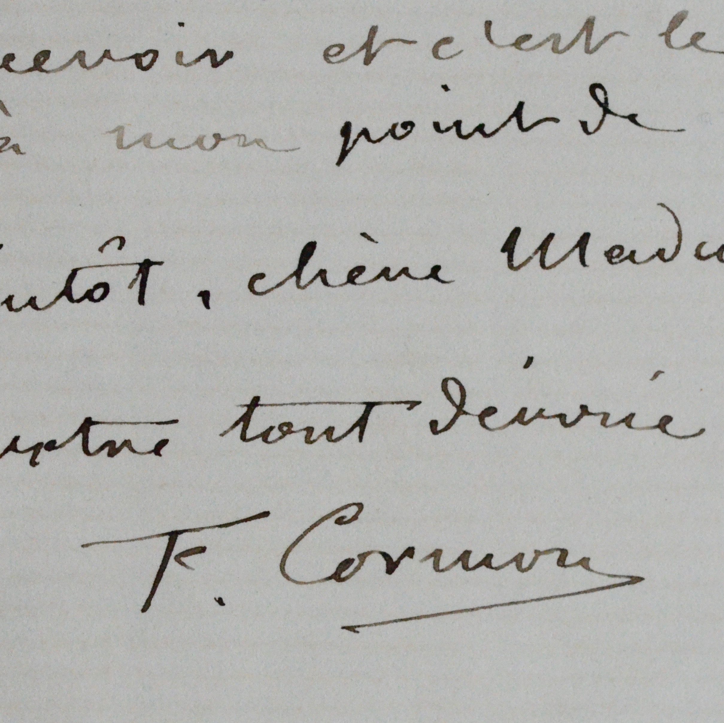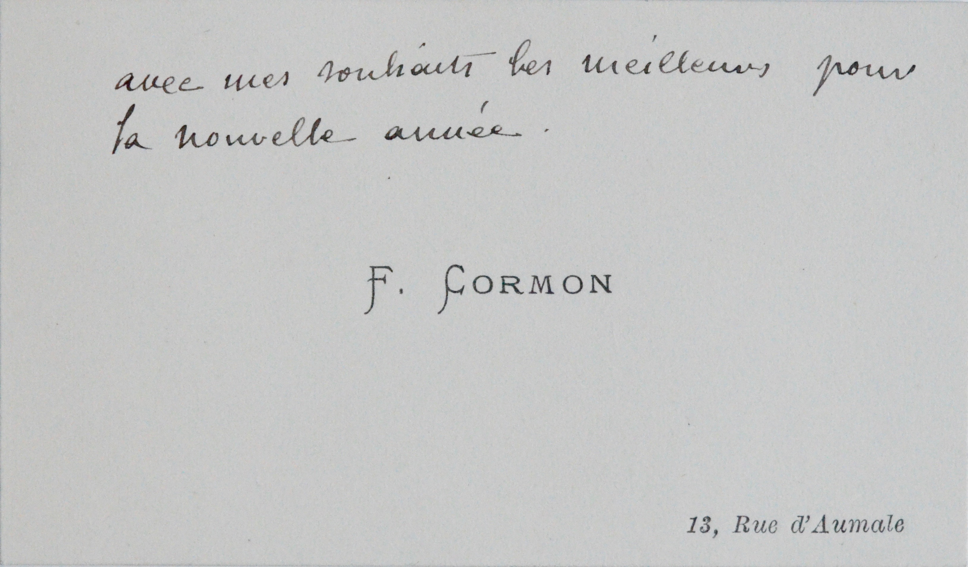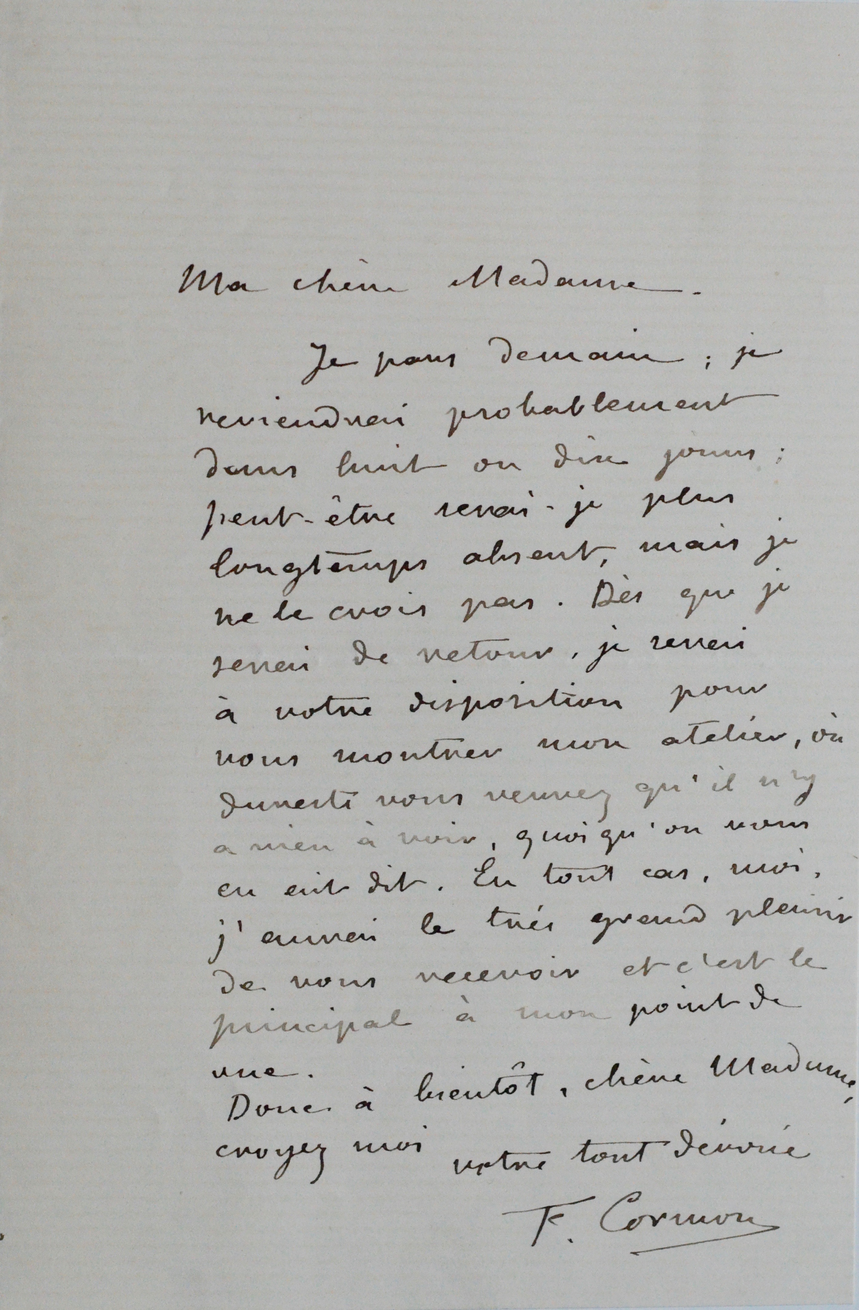 Fernand Cormon organise une visite de son atelier : "[...] Je pars demain : je reviendrai probablement dans huit ou dix jours ; peut-être serrai-je plus longtemps absent, mais je ne le crois pas. Dès que je serrai de retour, je serrai à votre disposition pour vous montrer mon atelier, ou du reste vous verrez qu'il n'y a rien à voir, quoiqu'on vous en ait dit. En tout cas, moi, j'aurai le très grand plaisir de vous revoir et c'est le principal de mon point de vue [...]".
