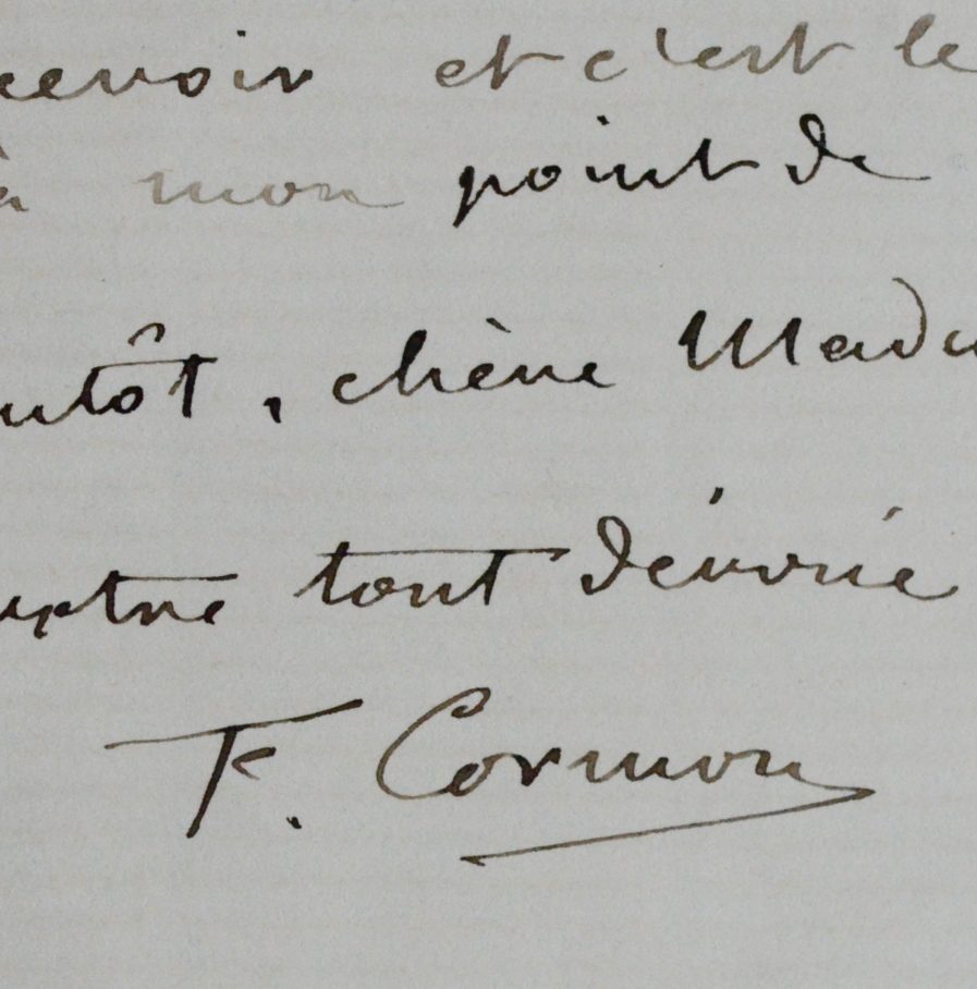 Fernand Cormon organise une visite de son atelier : "[...] Je pars demain : je reviendrai probablement dans huit ou dix jours ; peut-être serrai-je plus longtemps absent, mais je ne le crois pas. Dès que je serrai de retour, je serrai à votre disposition pour vous montrer mon atelier, ou du reste vous verrez qu'il n'y a rien à voir, quoiqu'on vous en ait dit. En tout cas, moi, j'aurai le très grand plaisir de vous revoir et c'est le principal de mon point de vue [...]".