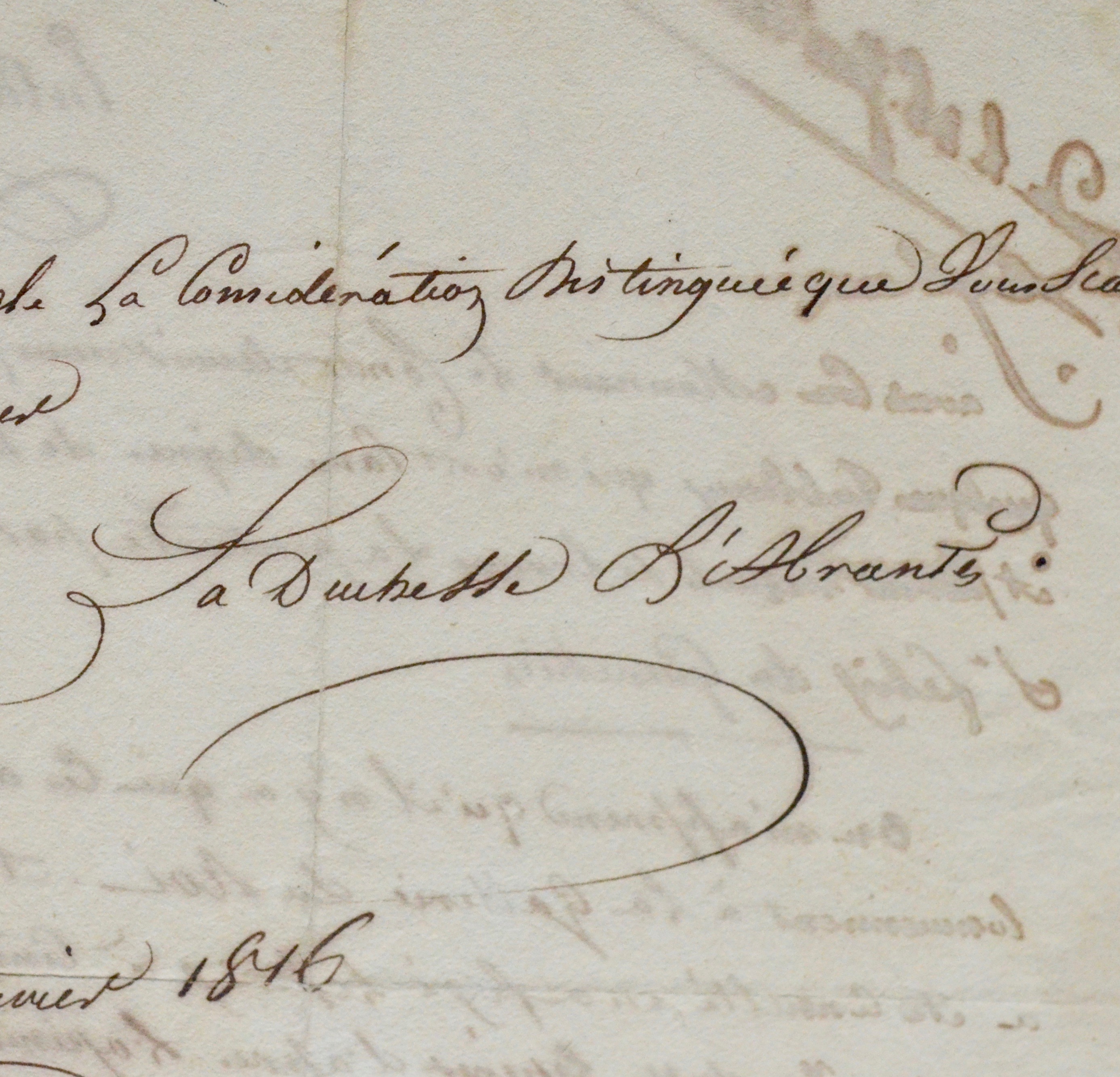 Laure Junot Abrantès (duchesse d') (Montpellier, 1784/1838)La duchesse d'Abrantès, endettée comme toujours, désire céder quelques précieux tableaux au Louvre, mais seuls deux ont été retenus par Vivant Denon. Il s'agit de La Pentecôte, par Guido Reni (dit Le Guide) et de Saint-Félix, du Guerchin. "[...] On m'apprend qu'il n'y a que ces deux tableaux qui conviennent à la Gallerie du Roi, et que M. Denon qui a été consulté en a fixé le prix à cinquante mille francs quoique je dusse espérer d'après l'opinion des artistes qui les ont vus, d'en obtenir un prix beaucoup plus considérable. Je consents [sic] puisque c'est pour le muséum de Sa Majesté de les donner pour cinquante mille francs [...]". Elle demande à son correspondant de faire payer cette somme à son beau frère M. de Geouffre.