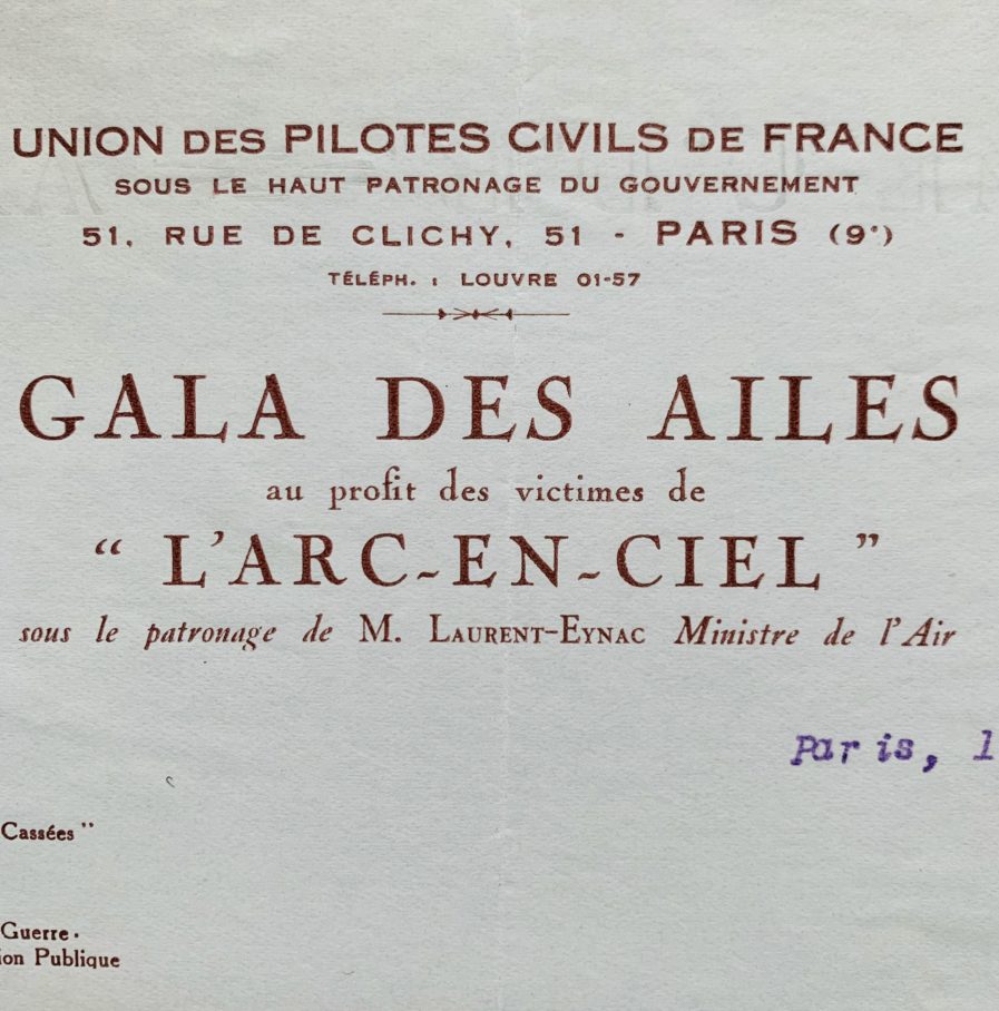 "Vous n'avez certainement pas oublié la terrible catastrophe survenue à Orly, au mois d'août dernier, qui anéantit l'avion "Arc en Ciel", au moment où il allait tenter la traversée de l'Atlantique. Nous vous informons que, pour venir en aide aux familles des victimes, un Comité de Secours a été constitué [...]. Une souscription a été ouverte en faveur des victimes de cet accident, et, plus particulièrement, pour la petite Monique Drouhin, âgée de quelques mois, afin de lui assurer son avenir [...]".