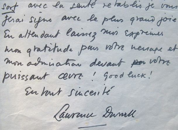 Il aurait souhaité accepter sa proposition mais «voici deux-trois ans, j'ai commencé à avoir des ennuis de santé, et maintenant, obligé de couper le tabac et le vin, je n'ai plus de vie sociale, je suis devenu l'homme des cavernes !». Il est obligé de suivre un traitement long et pénible. «Si à la fin, je sors avec la santé rétablie, je vous ferai signe avec la plus grande joie». Il lui exprime toute sa gratitude : «Mon admiration devant votre puissant oeuvre ! Good luck !».