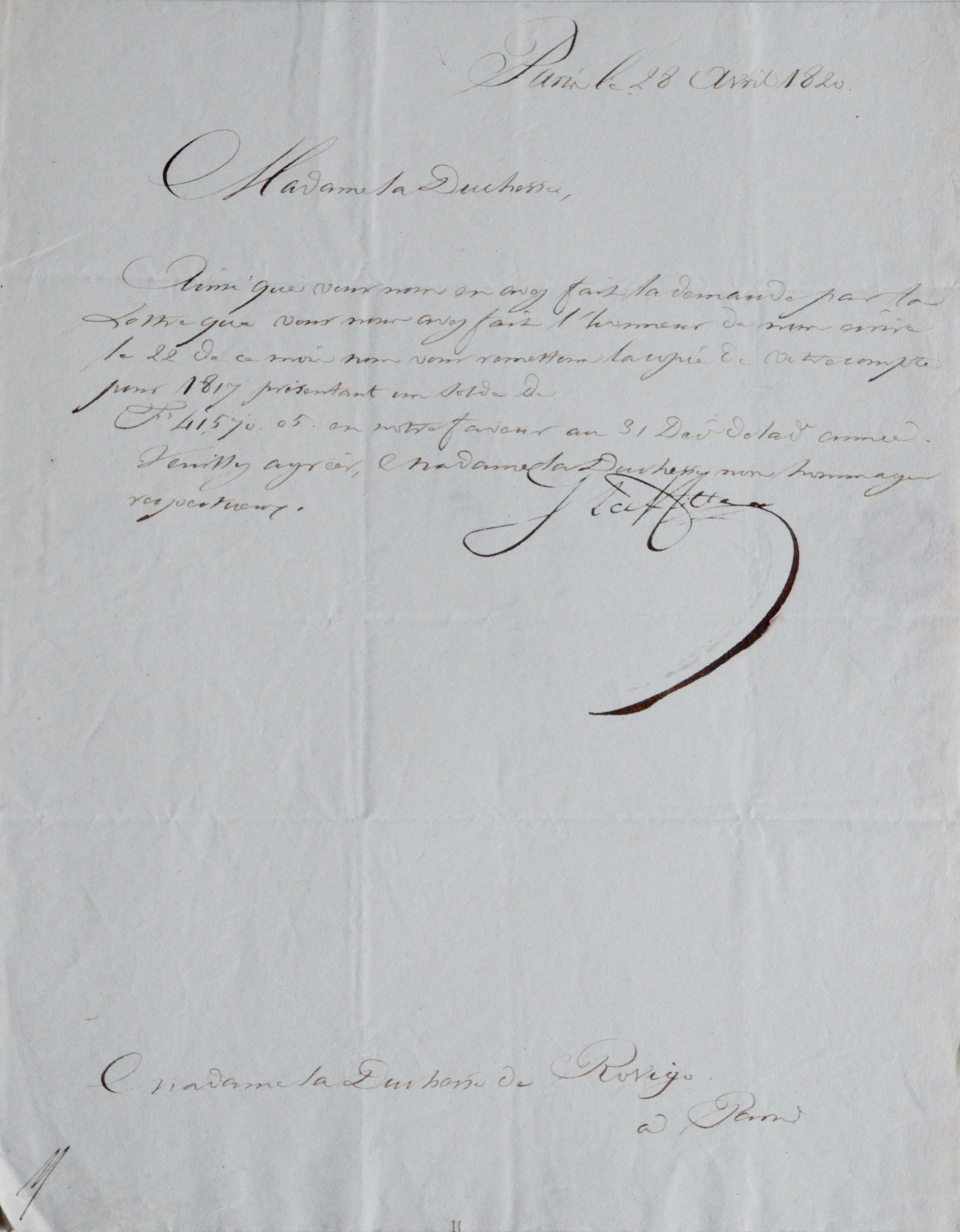 Le banquier Jacques Laffitte, alors gouverneur de la Banque de France, adresse une copie de compte à la duchesse de Rovigo, pour l'année 1817 "présentant un solde de 41 570, 05 francs en votre faveur au 31 décembre de ladite année [...]".