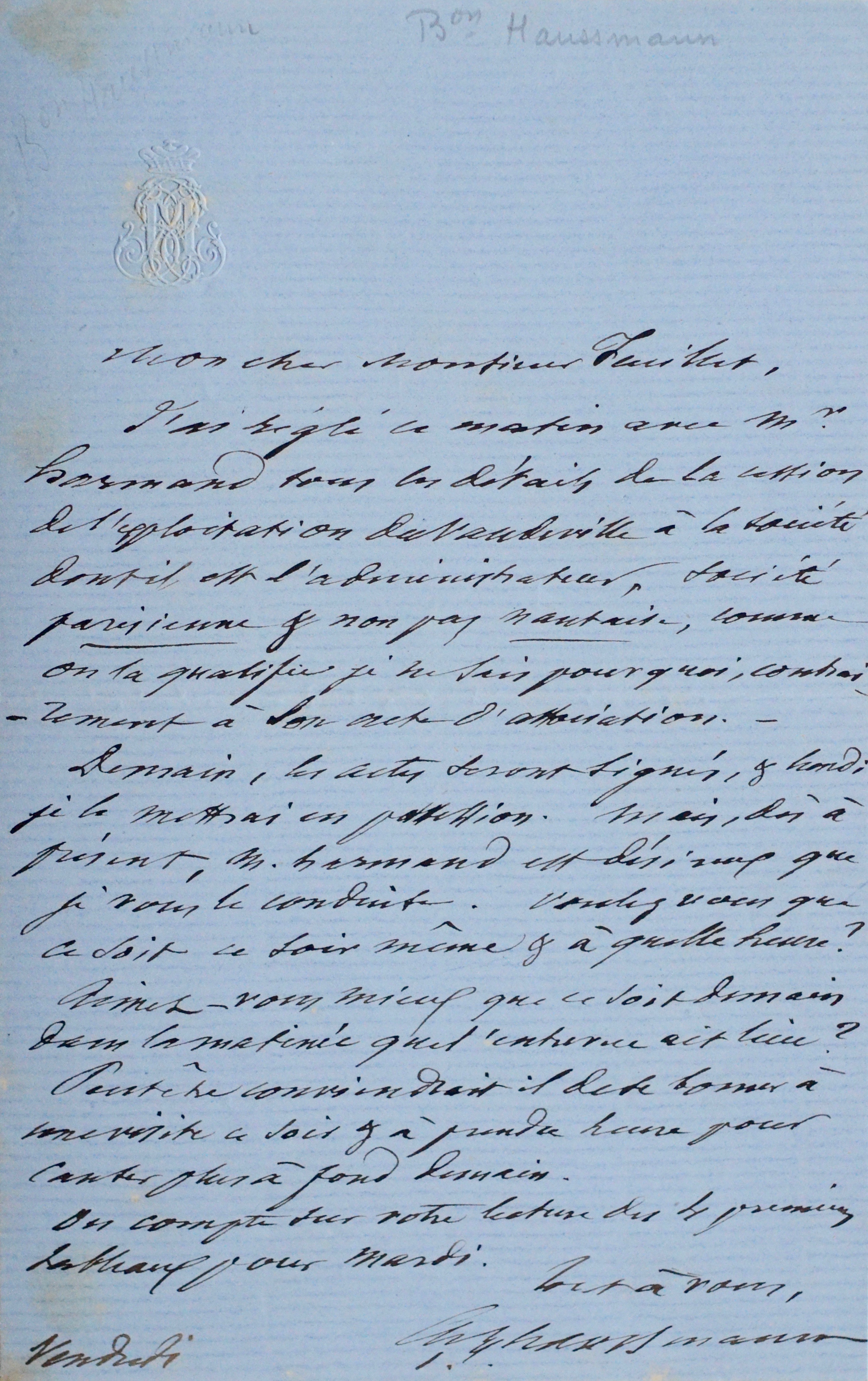 Le baron Haussmann, de concert avec Gustave Harmant, directeur du Théâtre du Vaudeville, a réglé "tous les détails de la cession de l'exploitation du Vaudeville à la société dont il est l'administrateur, parisienne & non pas nantaise comme on la qualifie je ne sais pas pourquoi [...]. Demain les actes seront signés, & lundi je les mettai en possession [...]". Haussmann propose de faire déposer les documents chez Feuillet et tache de fixer un rendez-vous.