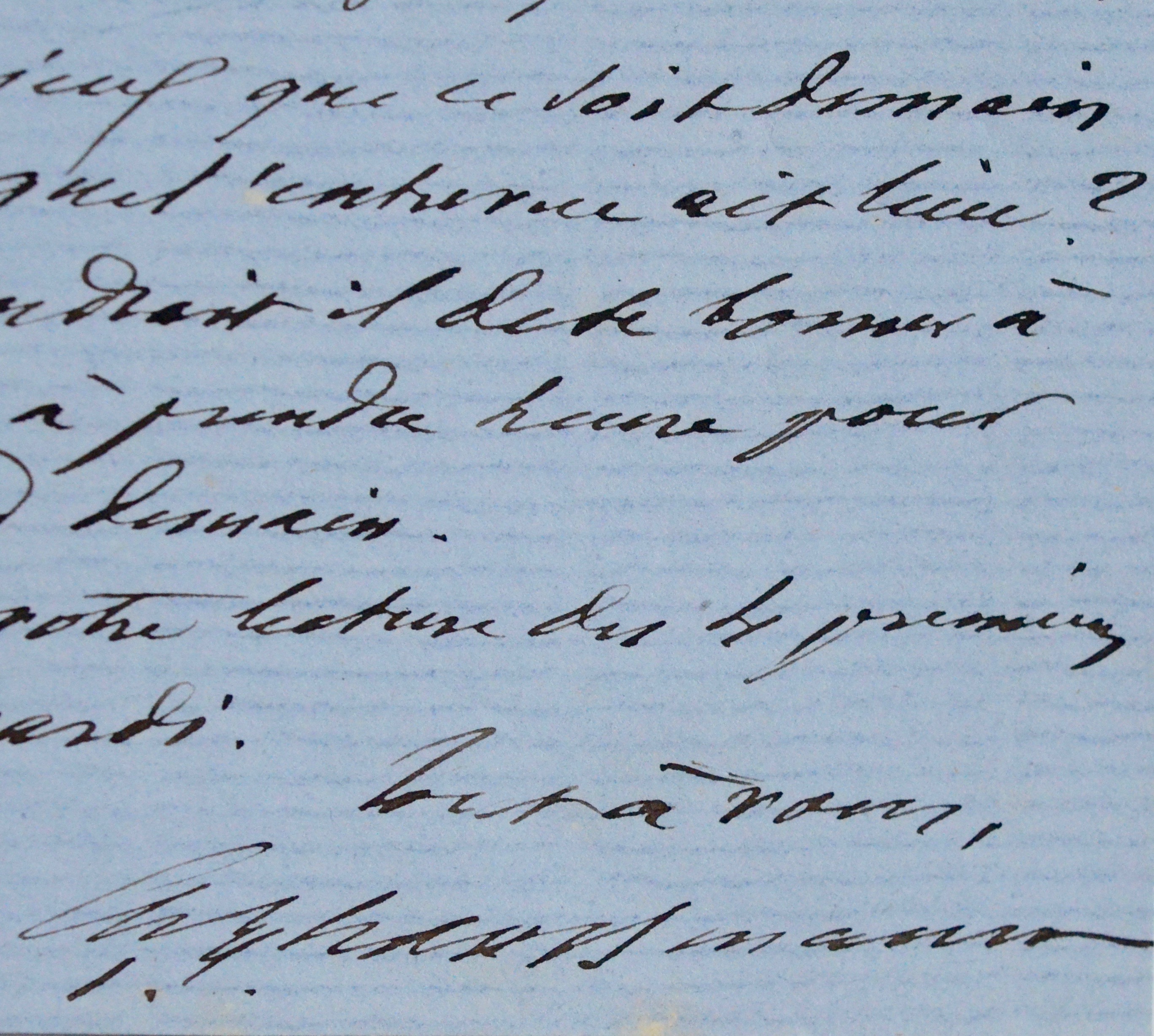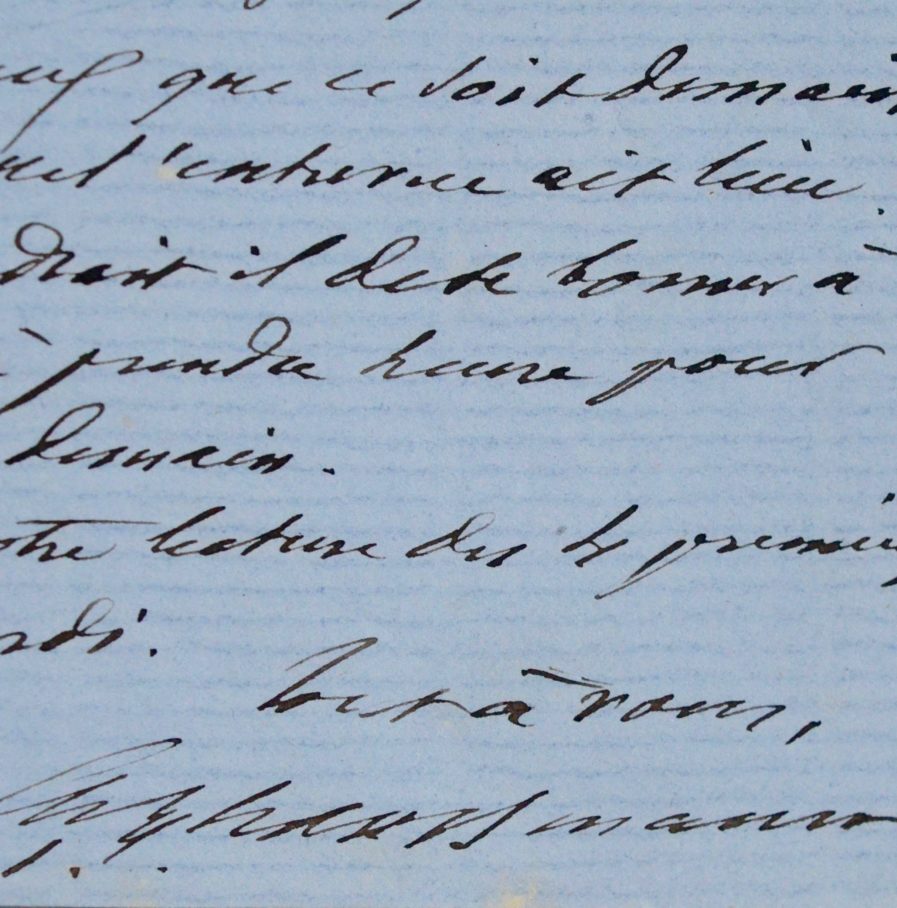 Encre noire sur feuillet double de papier bleu vergé. Chiffre H gaufré en tête.