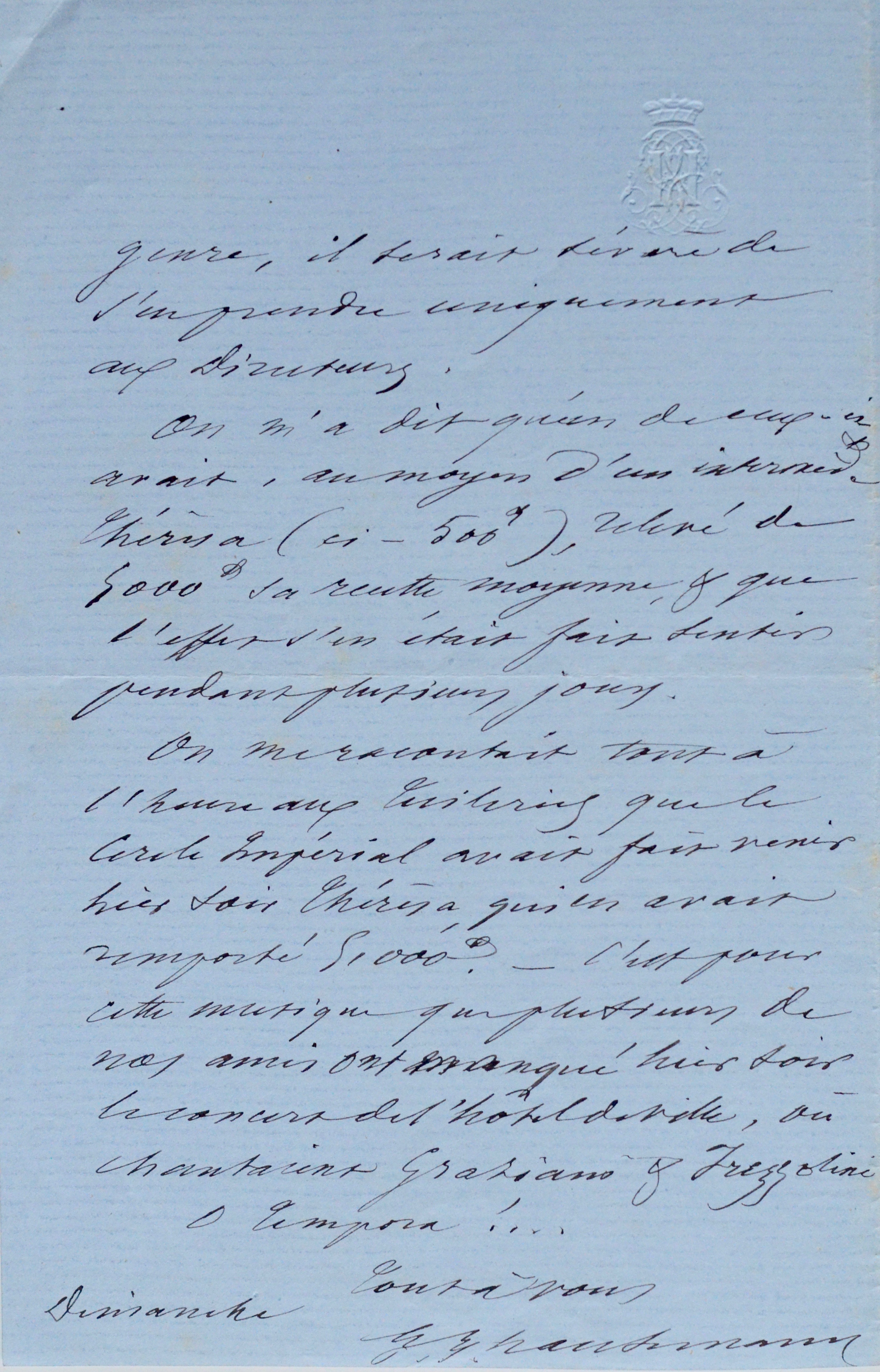 Gustave Harmant, directeur du Théâtre du Vaudeville, est venu le voir la veille, mais il n'a pu le recevoir car "l'Empereur m'envoyait chercher".