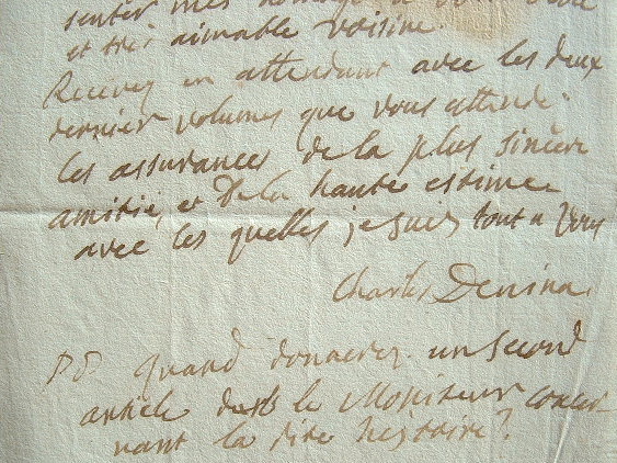 «Comme auteur ou condisciple, si vous avez des maîtres, vous trouverez chez moi du café ou du chocolat également prêt et en retournant dans vos quartiers, vous serez chargé de présenter mes hommages à votre belle et très aimable voisine». Il lui adresse les deux volumes attendus et demande, en post scriptum : «Quand donnerez vous un second article dans le Moniteur concernant la dite histoire ?».