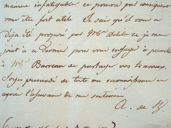 Auguste de Saint-Hilaire félicite son confrère pour le «poste honorable» que l'Institut lui a confié, et lui recommande un jeune homme «qui désire ardemment vous accompagner, M. Barreau, qui a déjà fait deux voyages sur mer et qui est rempli de zèle. Il n'a pas l'habitude de décrire, mais il récoltera d'une manière infatigable et pourra par conséquent vous être fort utile [...]».
