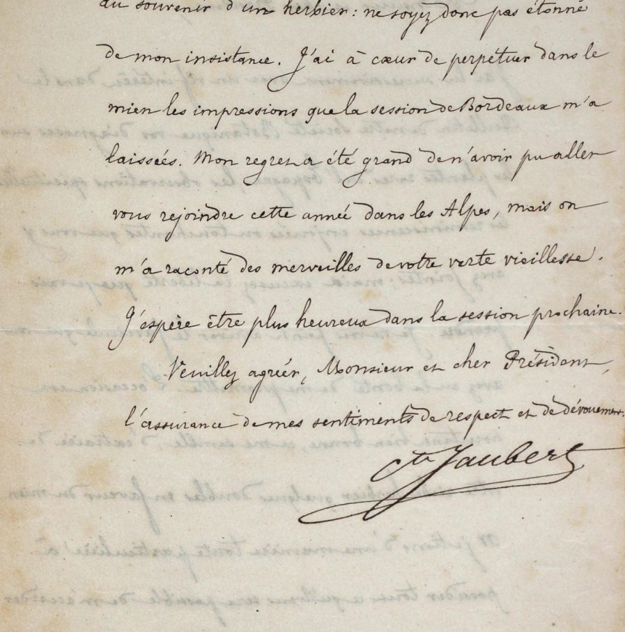 Hippolyte Jaubert (Paris, 1798/1874)Intéressante lettre du botaniste Hippolyte Jaubert sur la constitution de son grand herbier. Il s'adresse à Léon Dufour pour le compléter par des échanges. "J'ai lu successivement avec un vif intérêt dans le Bulletin de notre Société Botanique vos diagnostics sur les plantes rares de l'Espagne, les observations spirituelles, les réminiscences enjouées ou touchantes que vous y avez jointes ; mais excusez la liberté que je vais prendre. Je ne vois point arriver le fascicule que vous avez eu la bonté de me promettre. L'occasion est pourtant bien bonne, ce me semble, d'extraire de votre riche herbier quelques doubles en faveur du mien. Or je tiens de manière toute particulière à posséder tout ce qu'il vous sera possible de m'accorder de plantes recueillies, étiquetées par vous, surtout des espèces qui vous doivent leurs noms. Personne n'a mieux dépeint que vous le charme qui s'attache au souvenir d'un herbier : ne soyez donc pas étonné de mon insistance. J'ai à coeur de perpétuer dans le mien les impressions que la session de Bordeaux m'a laissées. Mon regret a été grand de n'avoir pu aller vous rejoindre cette année dans les Alpes, mais on m'a raconté des merveilles de votre verte vieillesse [...]".