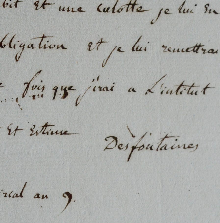 "Je prie le citoyen Cardot de remettre au Cen Cartier tailleur le drap noir nécessaire pour faire un habit et une culotte ; je lui en aurai beaucoup d'obligation et je lui remettrai un reçu la 1ère fois que j'irai à l'Institut". En bas, détail du prix.