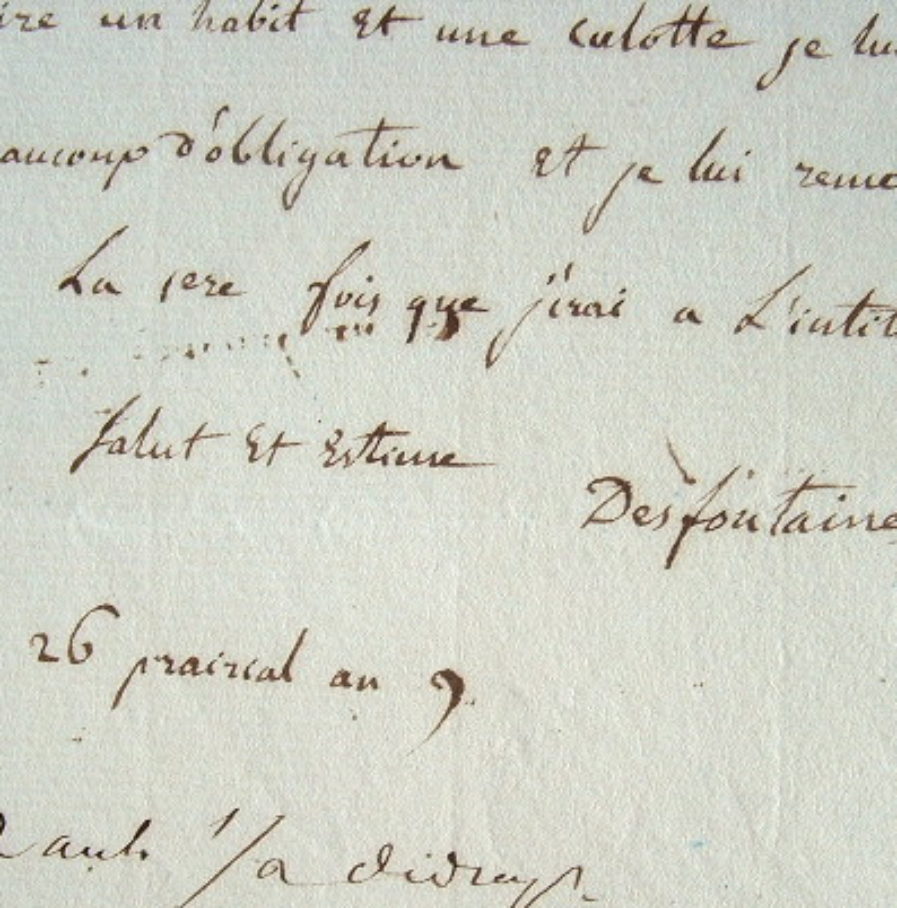 "Je prie le citoyen Cardot de remettre au Cen Cartier tailleur le drap noir nécessaire pour faire un habit et une culotte ; je lui en aurai beaucoup d'obligation et je lui remettrai un reçu la 1ère fois que j'irai à l'Institut". En bas, détail du prix.