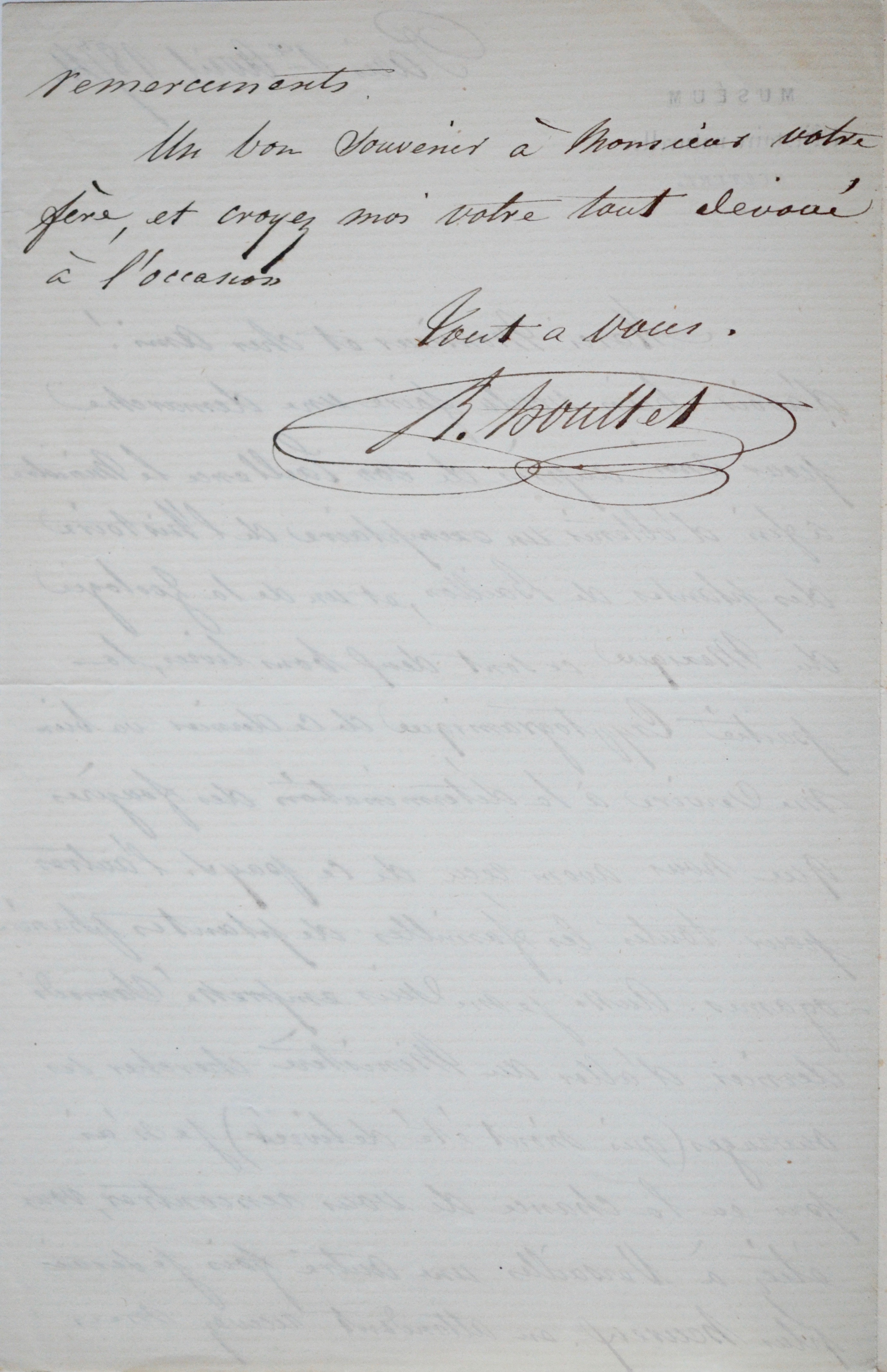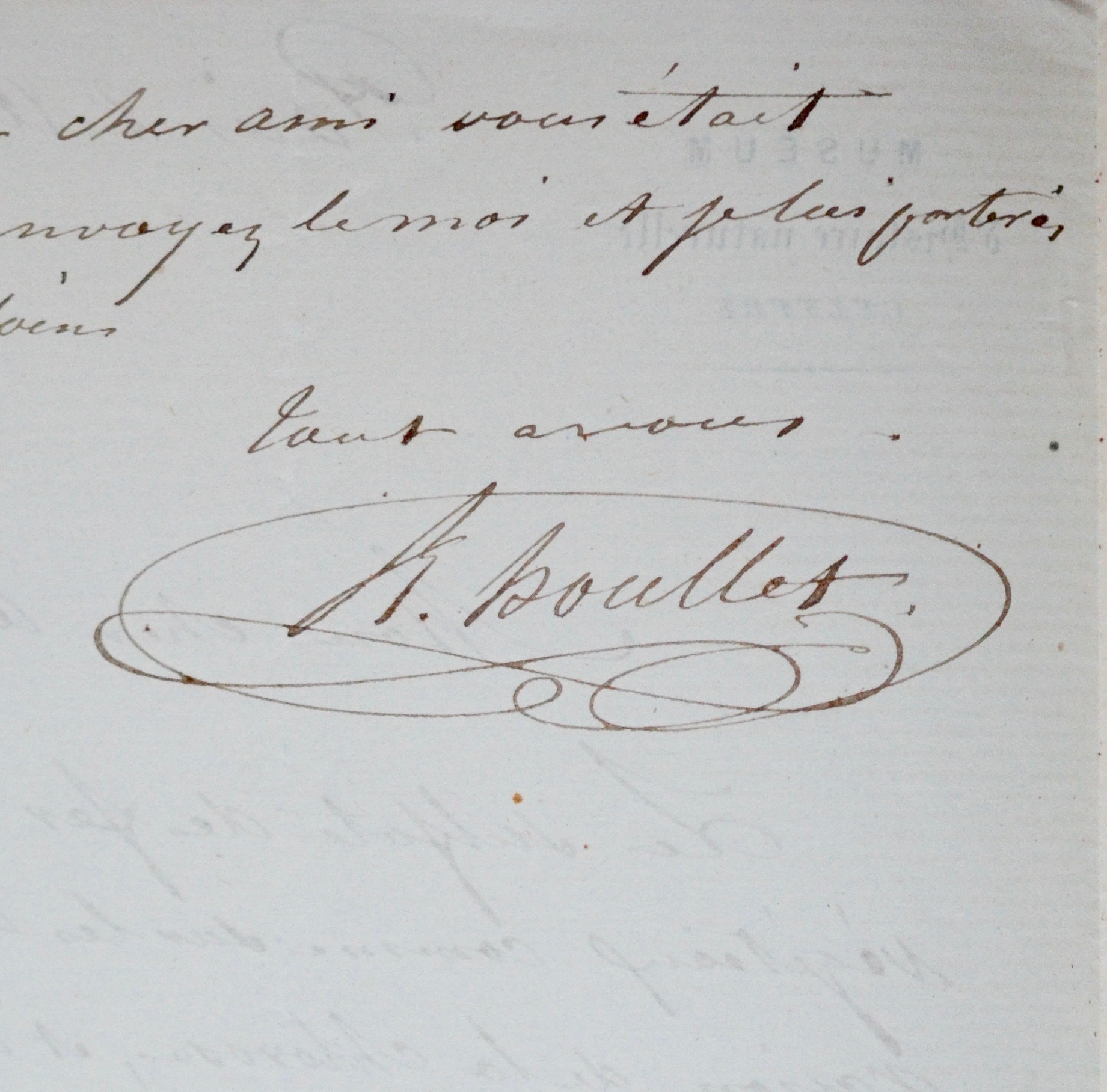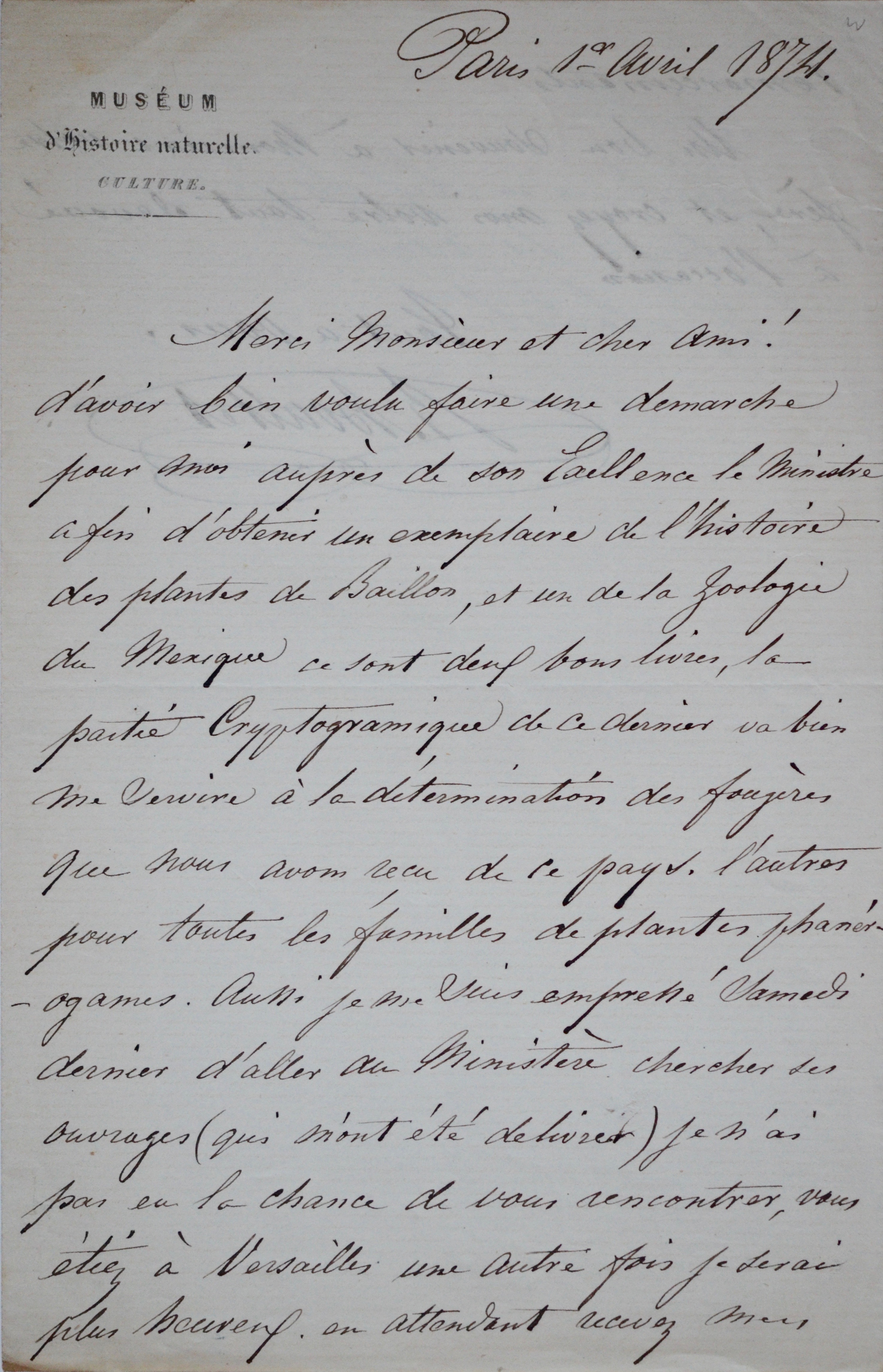 "Merci Monsieur et cher ami ! d'avoir bien voulu faire une démarche pour moi auprès de son Excellence le Ministre afin d'obtenir un exemplaire de l'Histoire des Plantes de Baillon, et un des la Zoologie du Mexique, ce sont deux très bons livres, la partie Cryptogamique de ce dernier va bien me servir à la determination des fougères que nous avons reçu de ce pays. L'autre pour toutes les familles de plantes phanérogames [...]".