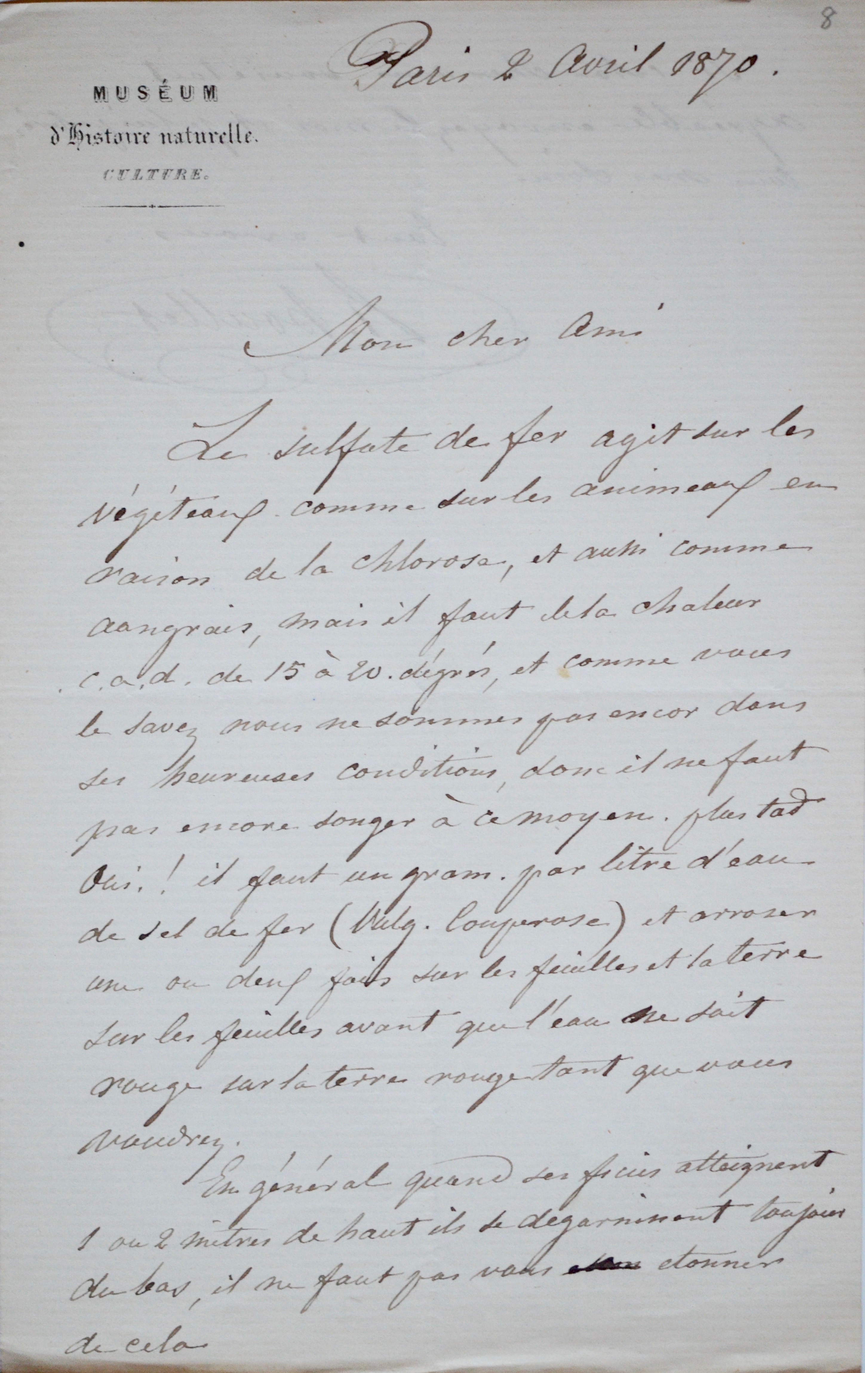 "[...] Le sulfate de fer agit sur les végétaux comme sur les animaux en raison de la chlorose, et aussi comme [?]angrais, mais il faut de la chaleur c.a.d. de 15 à 20 degrés, et comme vous le savez nous ne sommes pas encor [sic] dans ces heureuses conditions, donc il ne fait pas encore songer à ce moyen [...] il faut un gramme par litre d'eau de sel de fer (Vulg. Couperose) et arroser une ou deux fois sur les feuilles et la terre [...]". (2/04/1870).