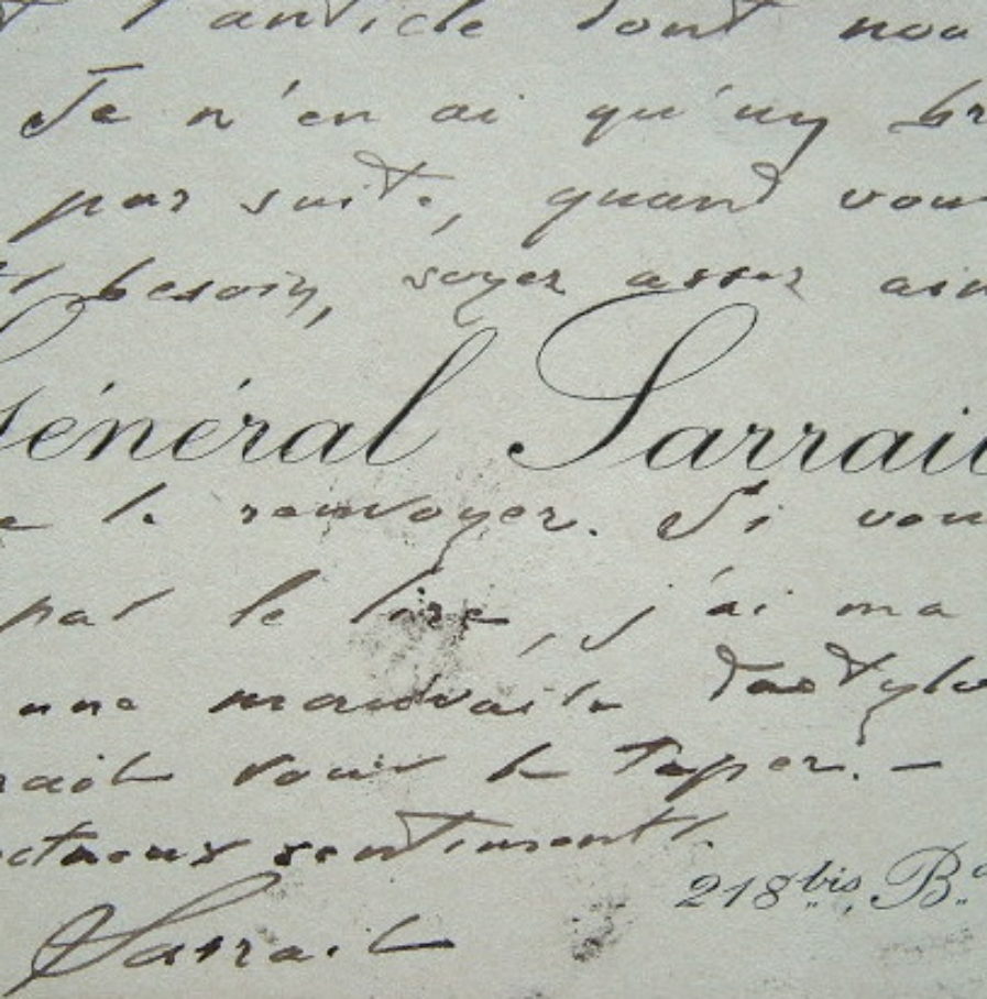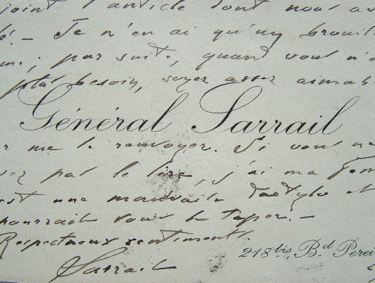 Le général Sarrail adresse son article. «Je n'en ai qu'un brouillon informe ; par suite, quand vous n'en aurez plus besoin, soyez assez aimable pour me le renvoyer. Si vous ne pouvez pas le lire, j'ai ma femme qui est une mauvaise dactylo et elle pourrait vous le taper».
