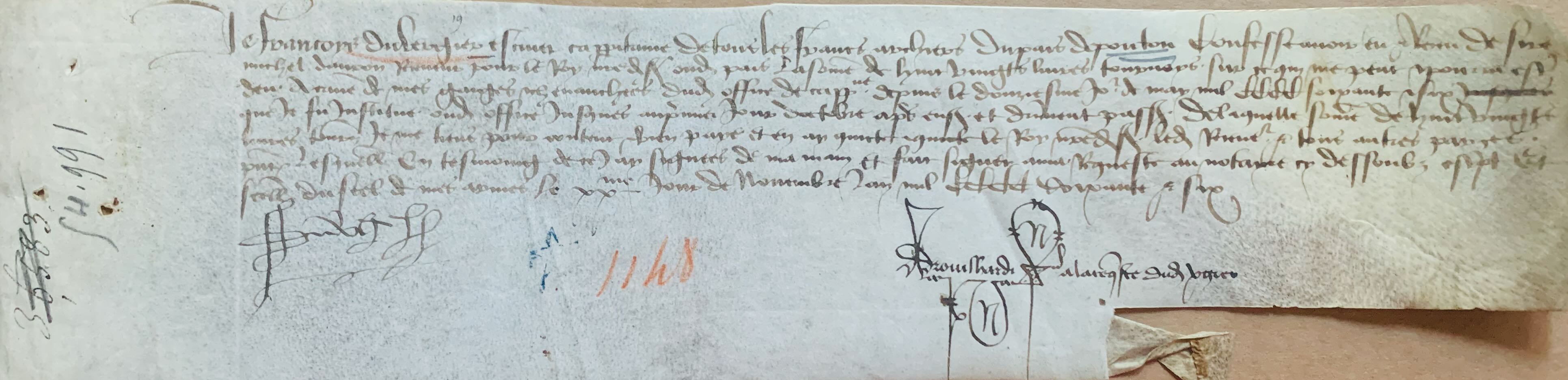 Quittance de paiement signée par François Du Vergier "escuier capitaine de tous les francs archiers du pais de poitou", délivrée par Michel Dauron receveur du roi, d'une somme de "huit vingt livres tournois [...] pour mes gaiges dudit office de cappitaine depuis le douziesme jour de may l'an mil cccc soixante et six que je fus institué audit office jusque au premier jour d'octobre [...]".