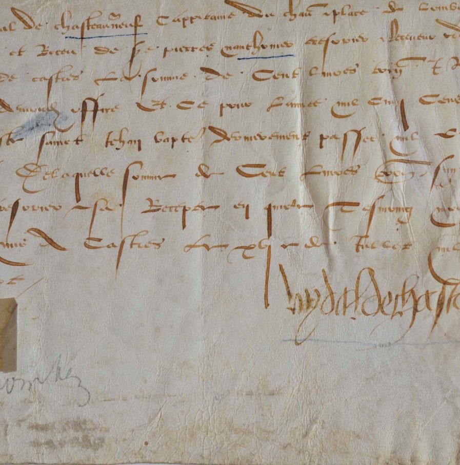 Parchemin signé par Vidal de Chasteauneuf, "cappitaine du chasteau et place de Lombez" ; il reçoit du receveur du comté de Castres, la somme de 100 livres tournois pour les gages de son office pour l'année 1516 finissant à la Saint-Jean Baptiste 1517.