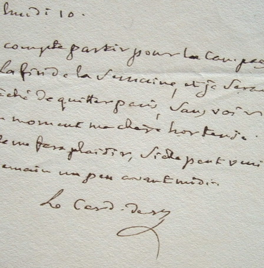 «Je compte partir pour la campagne à la fin de la semaine, et je serais fâché de quitter Paris sans voir un moment ma chère Hortense. Elle me fera plaisir si elle peut venir demain un peu avant midi. Le card. de B.»