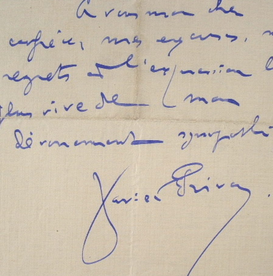 Après d'importantes inondations survenues à Paris, Xavier Privas apporte son concours à une oeuvre de bienfaisance. «Je dois partir lundi 14 en tournée avec Borel pour une quinzaine de jours [...]. Maintenant je tiens à participer à votre oeuvre bienfaisante. Je vous envoie une poésie que j'ai faite à l'occasion de la catastrophe. Je vous autorise à la faire tirer et à la vendre au profit des victimes de l'inondation [...]».