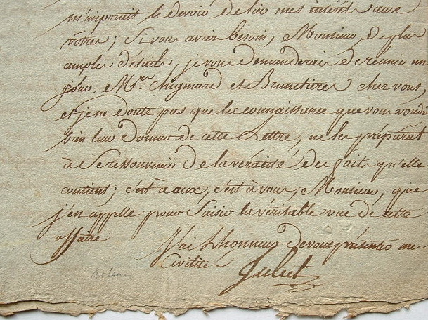 Antoine Juliet (Juillet dit) (Paris, 1755/1825)Lettre du chanteur Antoine Juliet, évocatrice de la concurrence entre le Théâtre Favart (opéra-comique) et celui, nouveau et à proximité, de la rue Feydeau, qui connait sous la Révolution un grand succès mais est aussi frappé, à plusieurs reprises, d'interdiction de représentation. Juliet a noté en haut de la lettre : «Copie de la lettre que j'ai écrite au citoyen Dufaÿsse pour la Compagnie Portarieu». Juliet refuse de rembourser l'argent qui lui a été alloué par la compagnie Portarieu, alors gérante du Théâtre Feydeau, au moment où il était fermé ; il s'agissait pour lui, non pas d'un prêt ou d'une avance, mais bien d'une indemnité due à l'immobilisation. «A l'époque de la faillite de la Compagnie Lebeau, il me fut fait, ainsi qu'à un autre camarade, la proposition de m'engager au Théâtre Favart, à des appointements de dix huit mille francs par an, dont trois mille furent déposés chez Pérignon notaire, qui peut attester de la vérité du fait. Des offres aussi avantageuses, et qui devenaient d'autant plus certaines que le genre de l'opéra comique étant entièrement disparu de Feydeau allait revivre d'une manière plus avantageuse à celui de Favart ; la compagnie Portarieu sentit tellement ce désavantage pour elle, qu'elle fit tous ses efforts pour empêcher la conclusion de cette affaire, et que vous fûtes, monsieur, le principal agent qui me dissuada de contracter l'engagement qui m'était proposé au Théâtre Favart ; vous me fites même part de votre projet de réunir ces deux établissements à celui de Feydeau, et vous me fites espérer que j'y serais traité d'une manière avantageuse. Je vous fis la promesse de vous seconder de tout mon pouvoir, tant, parce que cette affaire était pour vos intérêts, que parce qu'elle me laissait l'espoir de rappeler à cette réunion, mes infortunés camarades de Feydeau, mais sous l'observation cependant que mes besoins particuliers et ceux de ma famille exigeaient que je me procurasse les fonds nécessaires à notre existence, jusqu'à l'époque de cette réunion à venir, qu'en conséquence puisque je ne m'engageais point aux Italiens, je projettais d'aller faire une tournée en province [...]. Il s'écoula plus de trois mois pendant lesquels je reçus successivement jusqu'à la concurrence d'une somme de 3600# et à chaque payement qui m'était fait, il m'était de nouveau certifié que ce n'était ni une avance ni un prêt que m'a fait la compagnie [...]». [En 1801, sur ordre de Bonaparte, alors Premier consul, la troupe Feydeau fusionnera avec celle de l'Opéra-Comique, qui doit abandonner la salle Favart, trop vétuste ; l'ensemble est rebaptisé Théâtre national de l'Opéra-Comique].