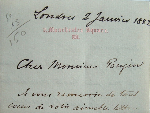 Julius Benedict désirait adresser un exemplaire de son ouvrage sur Weber [publié à Londres en 1881 ; Weber avait été son professeur dès 1821]. «Malheureusement, le premier tirage de 1000 exemplaires est épuisé, mais j'ai demandé à mes éditeurs de vous envoyer une copie de l'ouvrage aussitôt qu'il sera réimprimé». [Il ne le sera qu'en 1913].