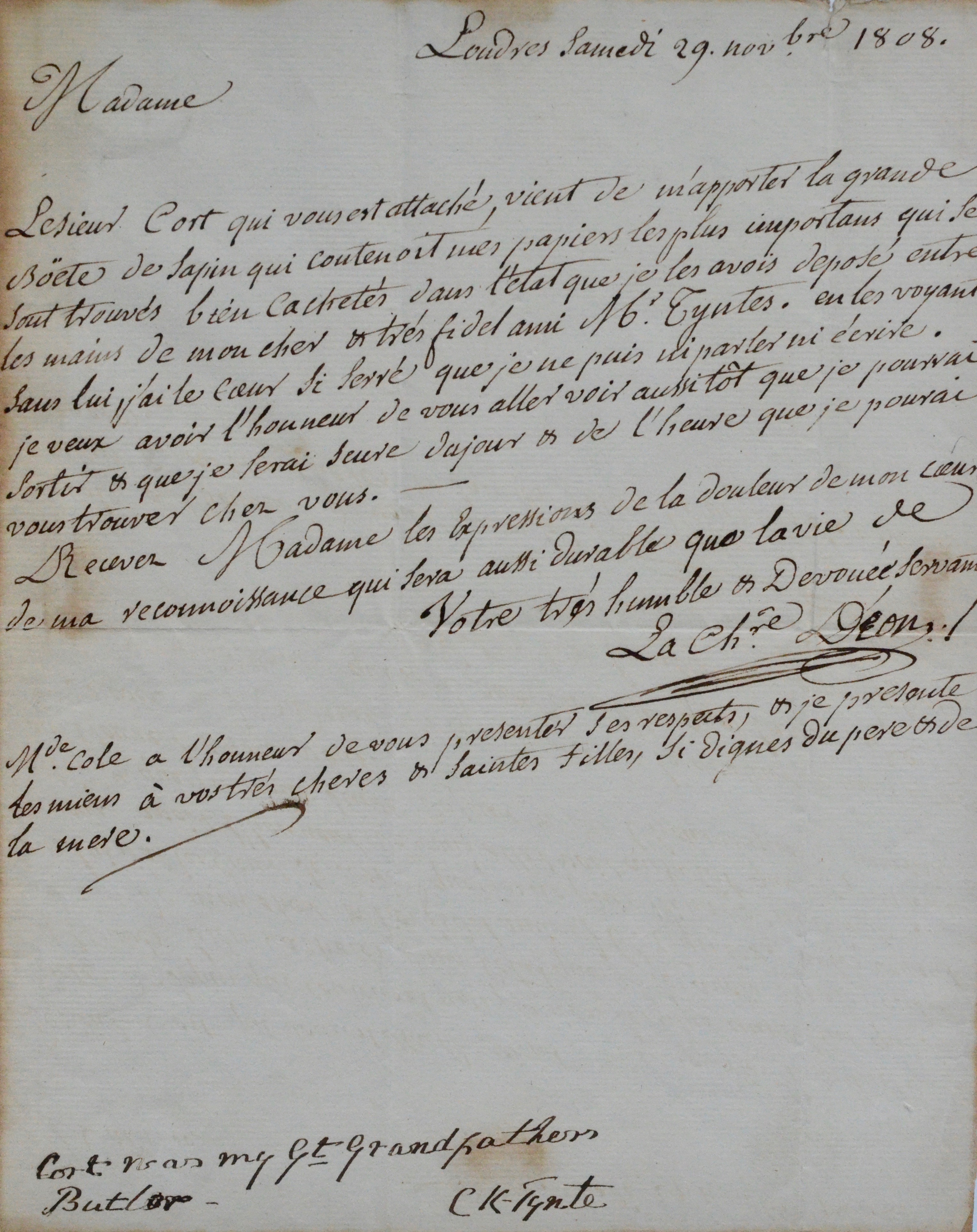 « Le Sieur Cort qui vous est attaché, vient de m’apporter la grande Boëte de sapin qui contenoit mes papiers les plus importans qui se sont trouvés bien cachetés dans l’état que je les avois déposé entre les mains de mon cher & très fidel ami Mr Tyntes. En les voyant sans lui j’ai le cœur si serré que je ne puis ni parler ni écrire. Je veux avoir l'honneur de vous aller voir aussitôt que je pourrai sortir et que je serai sûre du jour & de l'heure [...].