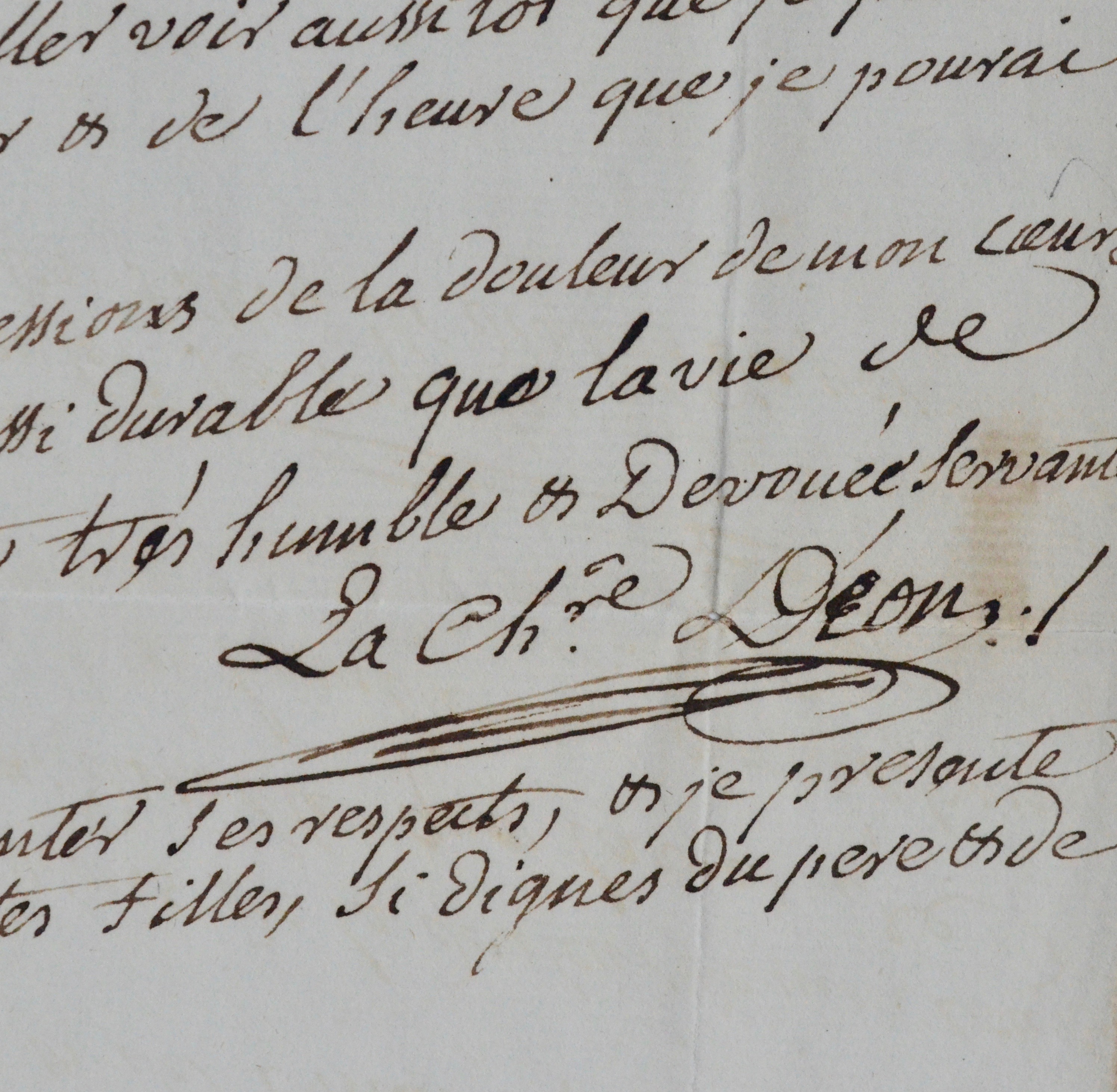 Charles Geneviève Eon de Beaumont (La Chevalière d'Eon) (Tonnerre (Yonne), 1728/1810)Intéressante lettre du chevalier d'Éon, agent secret et aventurier, travesti en femme, signée « La Chre [chevalière] D’Éon ».
