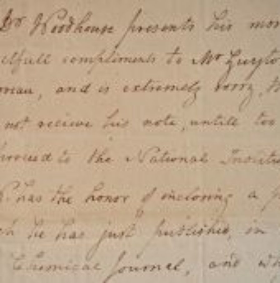 James Woodhouse adresse ses compliments à Guyton de Morveau et se désole qu'il n'ait pas reçu sa note destinée à l'Institut. "Dr W. has the honor of inclusing a paper which he has just published in Nicholsons Chemical Journal, and which contains some ideas, contrary to those, generally received".
