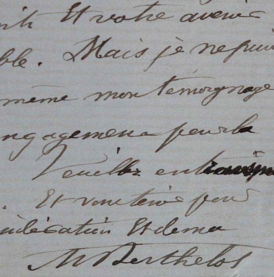Le grand chimiste Marcelin Berthelot, ancien ministre de l'Instruction publique, décline une invitation au banquet de l'Association des Maîtres Répétiteurs. "[...] J'aurais désiré vivement pouvoir vous donner cette nouvelle marque de la sympathie que je porte à la jeunesse laborieuse et dévouée à ses devoirs que vous représentez. Je sais quels services vous rendez et j'ai tâché d'assurer vos droits et votre avenir par une mesure durable. Mais je ne puis aller vous porter moi même ce témoignage [...]".