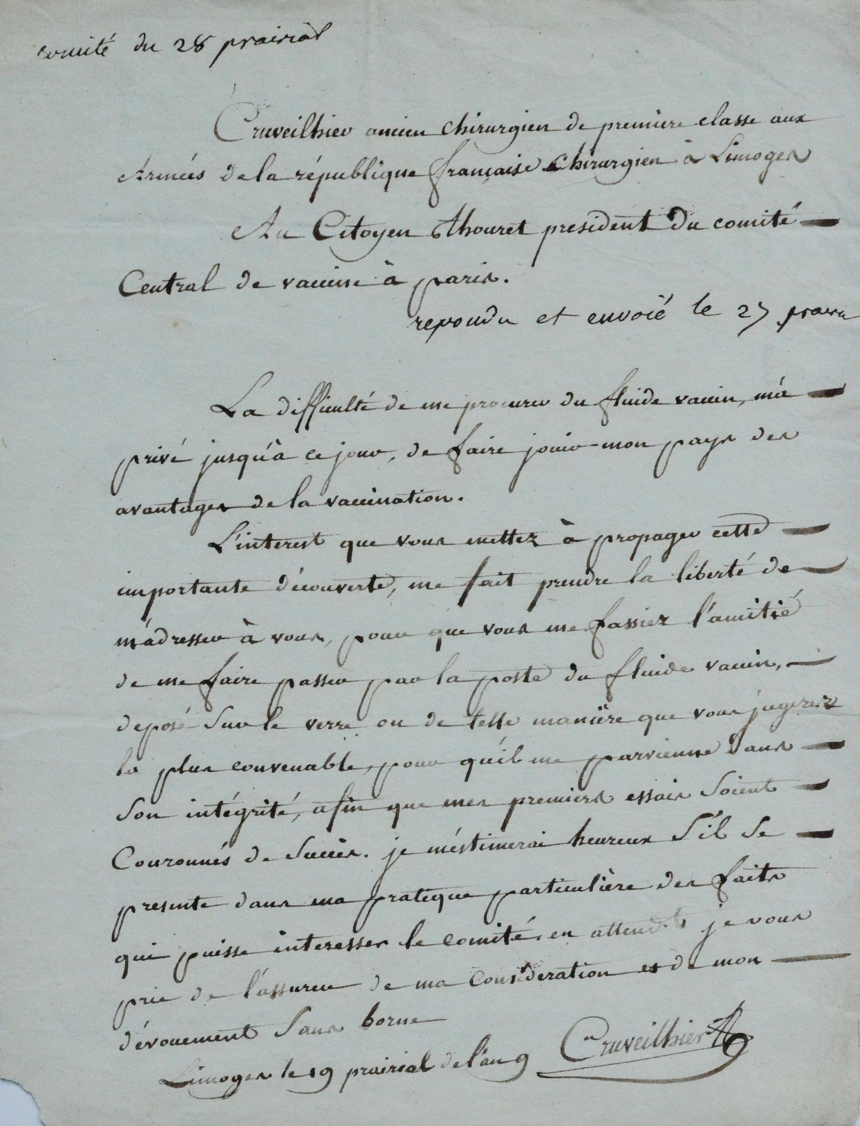 Léonard Cruveilhier, "chirurgien de première classe aux Armées de la République Française, chirurgien à Limoges", père de Jean Cruveilhier, veut tester et répandre la vaccine dans sa ville natale, Limoges.