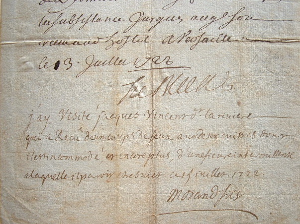 Lettre du Duc de Retz demandant l'admission aux Invalides de l'un de ses soldats, Jacques Vincent dit "La Rivière" : «à cause de ses infirmités et de ses blessures qui le rendent absolument incapable de servir, quoy que ce pauvre garçon n'aye pas assez longtems servy qu'il l'auroit souhaité [...]». Le ministre de la Guerre, Le Blanc, accepte la requête et signe l'admission. A la suite, quatre lignes autographes signées du chirurgien des Invalides, Sauveur-François Morand. «J'ay visité Jacques Vincent dit La Rivière qui a reçu deux coups de feu aux deux cuisses dont il est incommodé, et encore plus, d'une fièvre intermittente [...]».