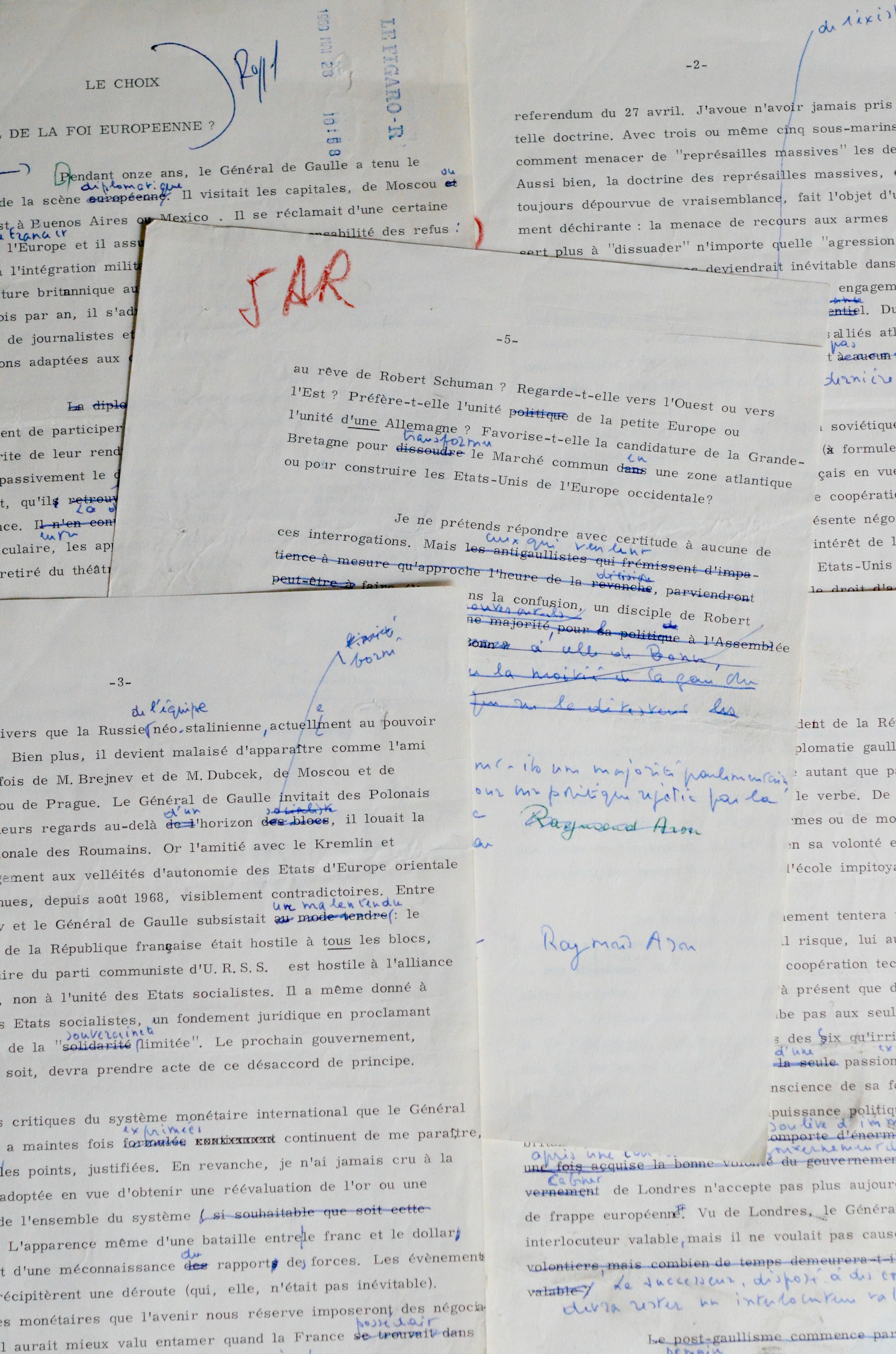 Raymond Aron (Paris, 1905/1983)Article de travail dactylographié avec nombreuses annotations, corrections et ajouts de la main de Raymond Aron, intitulé « Le choix : Réveil de la foi européenne ? ». Cet article fut publié dans Le Figaro, le 29 mai 1969 (deux tampons du journal à la date du 28 mai 1969), peu après le départ de De Gaulle.
